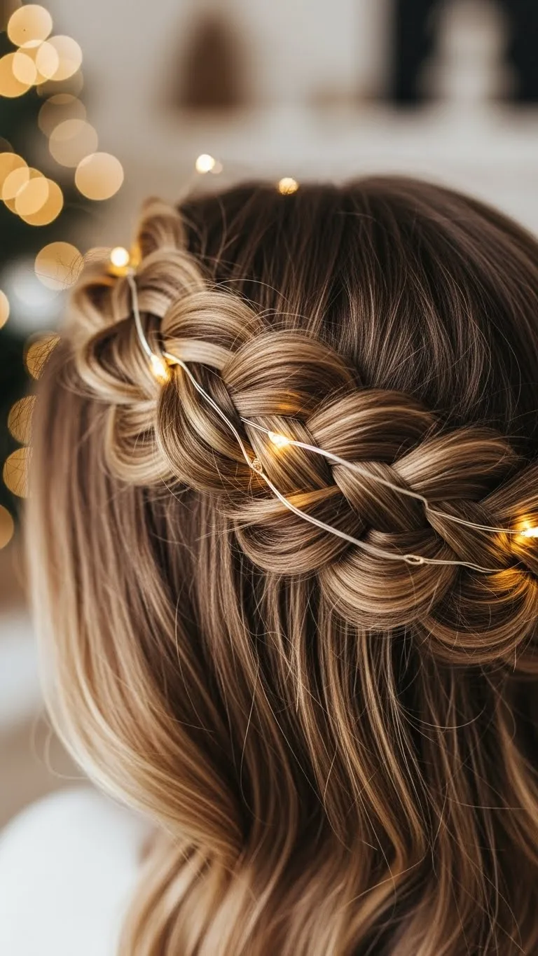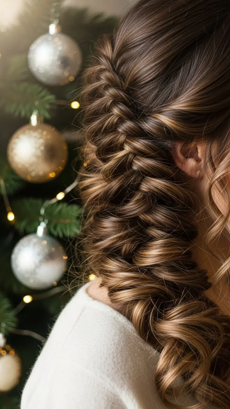 Braid a section from behind your ear. Pull it over your head like a headband. Pin it behind the other ear. Keep the braid loose so it blends with your hair. Curl the remaining hair lightly. This style feels playful but still polished for Christmas gatherings. If your hair isn’t long enough, use a cheap braided clip-in. They blend well when placed loosely.