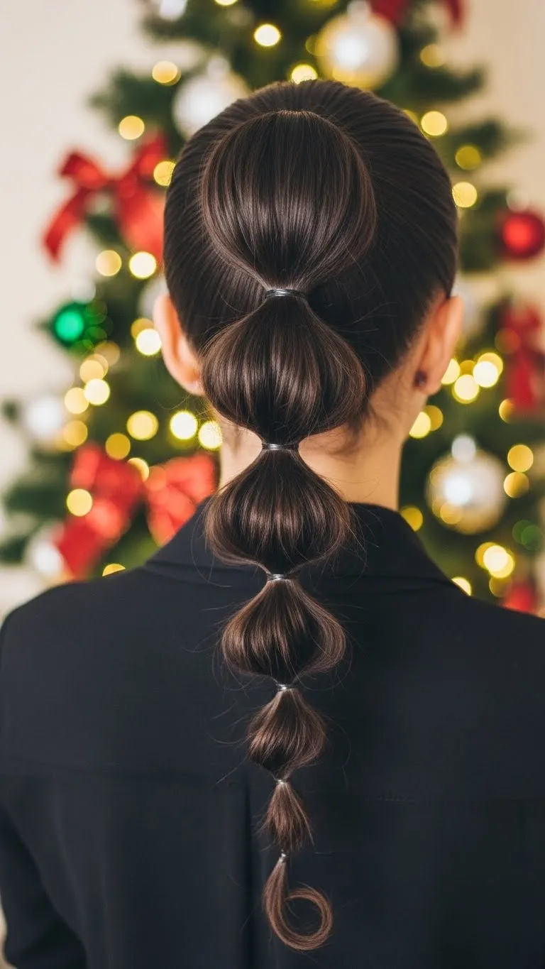 Bubble ponytails look stylish and take minutes to do. Tie your hair into a high or mid ponytail. Add elastics every two inches. Pull each section lightly to round it. Use matching elastics so it looks neat. Add a ribbon at the top for holiday flair. This style works for all hair types. It’s also great on second-day hair.