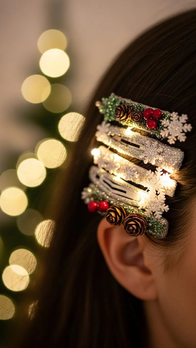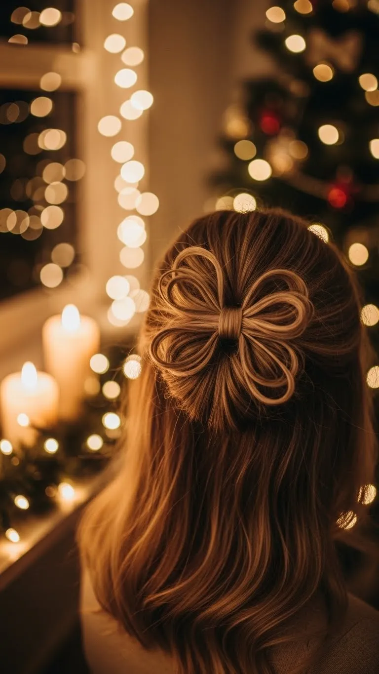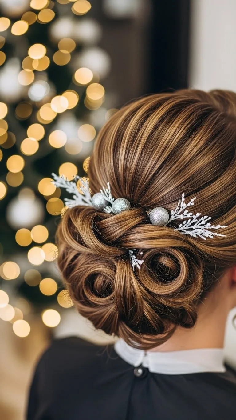This look works well for medium to long hair. Part your hair in the center or slightly off to the side. Twist two front sections toward the back. Secure them together using small pins. Keep the pins close to the twist so they stay hidden. Add tiny pieces of faux greenery or small pearl clips for a Christmas touch. You don’t need expensive accessories. Even small craft-store greenery works. Curl the rest of your hair lightly so it frames your face. This style holds well all night and suits both casual and dressy outfits. It also photographs nicely during indoor gatherings.