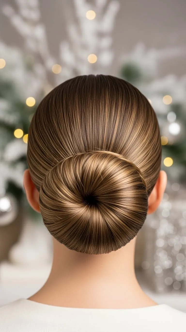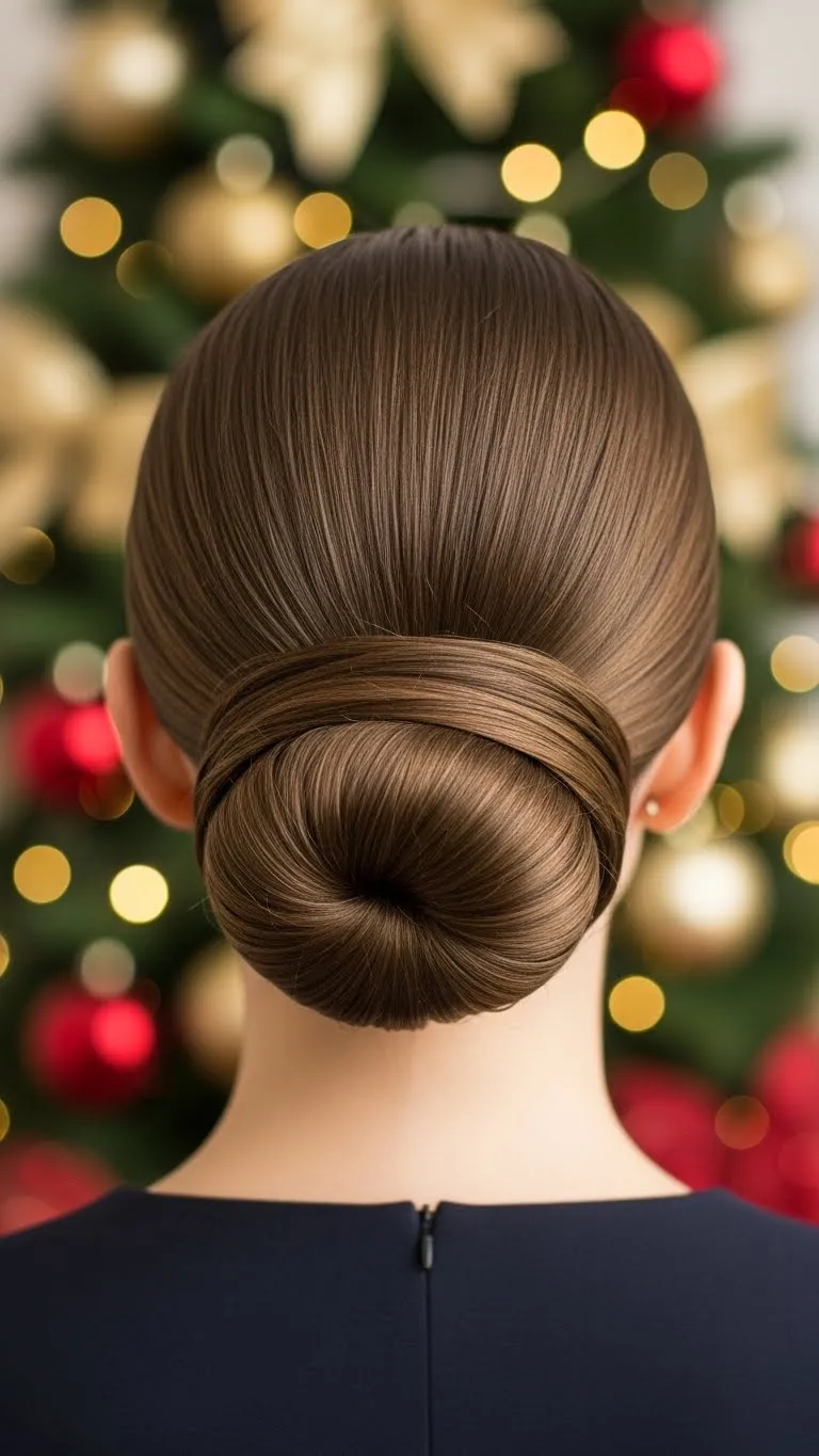 A sleek bun always looks sharp. Part the hair in the center and brush each side flat. Gather it low at the nape and twist it into a clean bun. Pin in place. Use a small amount of gel to smooth the top. This style works for busy party days because it stays tidy and doesn’t require retouching. Add small stud clips near the bun for a festive detail. If you want height, place the bun slightly higher. Both options look polished. This style also pairs well with statement earrings for Christmas photos.