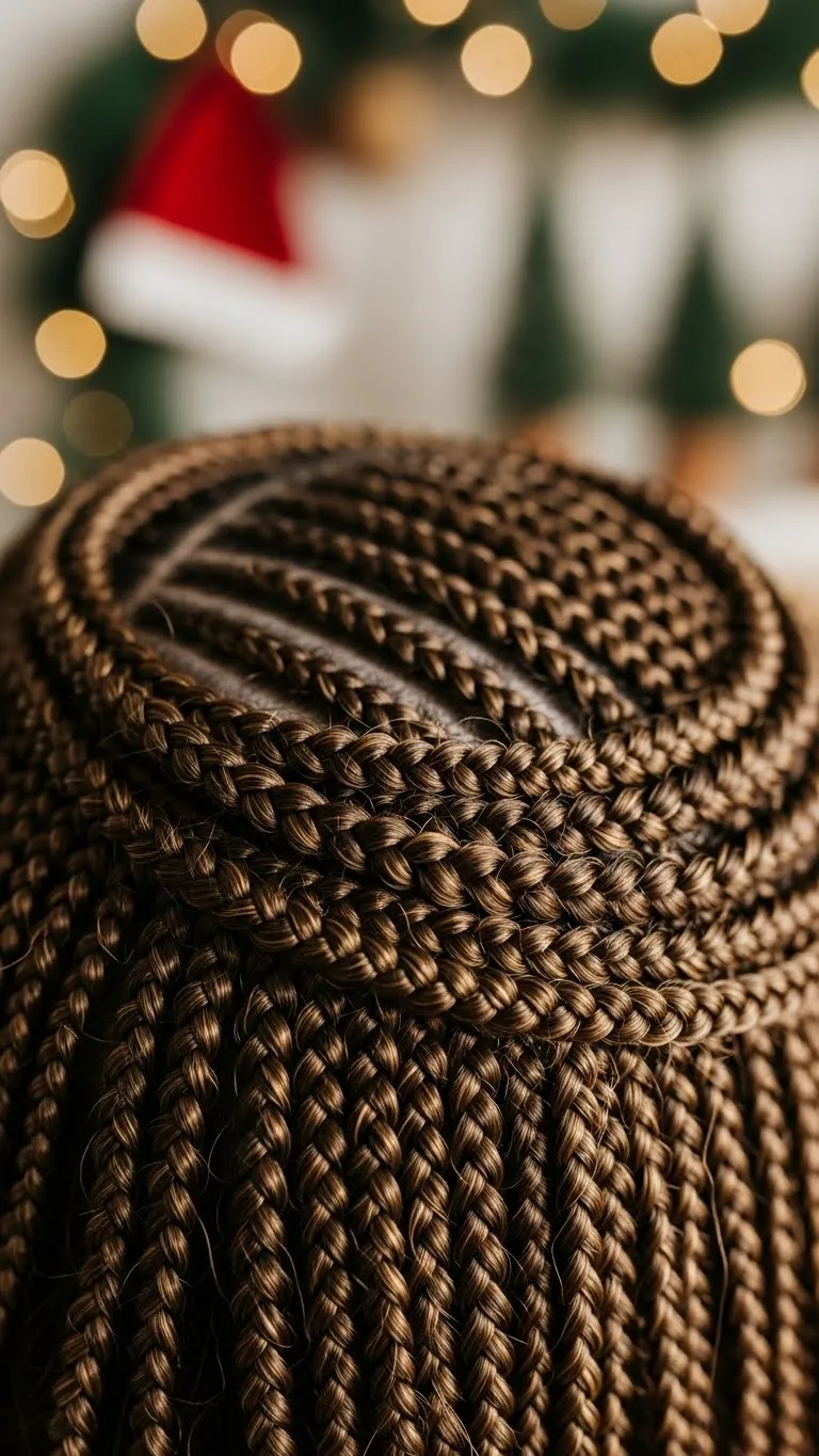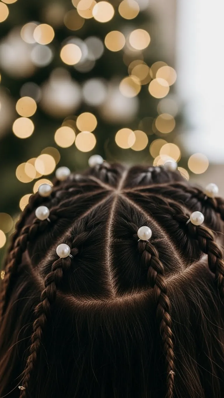 Create two tiny braids from each side of your head. Wrap them across the top and pin them down. The small size keeps the look simple but pretty. Curl the rest of your hair or keep it straight. Add small pearl pins along the braids to match holiday outfits. Braids stay in place for hours, making this perfect for long events. It also works well for short hair if you braid only the front pieces.