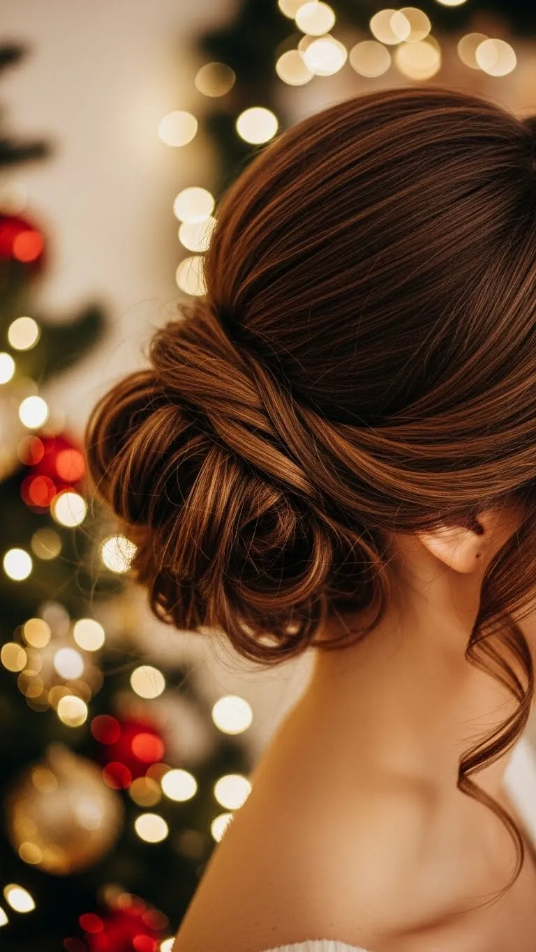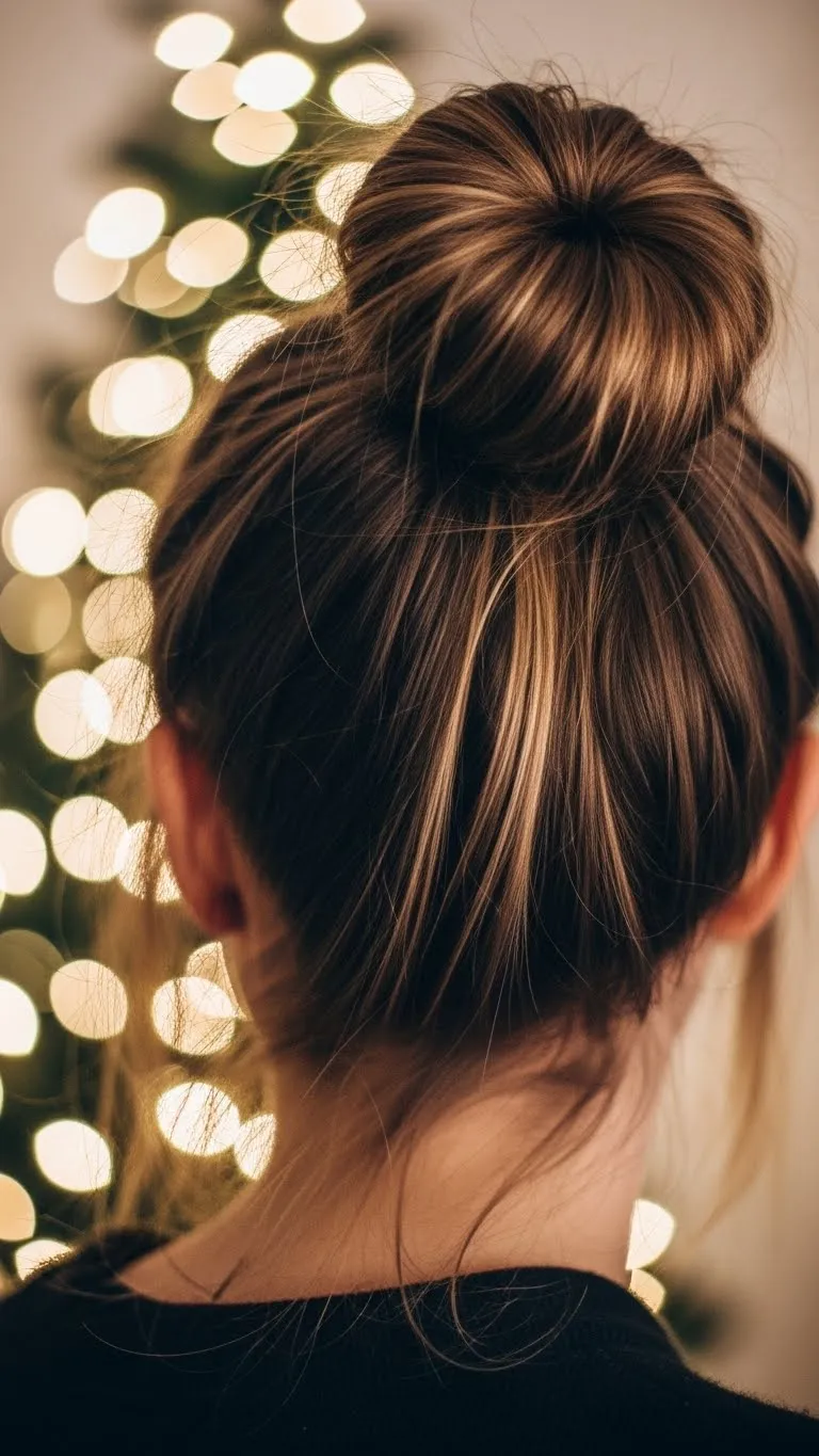 A messy top knot gives a relaxed party vibe. Flip your head, gather your hair high, and twist into a loose bun. Pull a few strands out around your face. Add a scrunchie or sparkly clip for a holiday touch. This look is great when you’re short on time. If your hair is shorter, create two small buns and pin them together for more fullness. Add dry shampoo for extra texture. You don’t need perfect hair for this. The messier it looks, the better it fits the holiday season.
