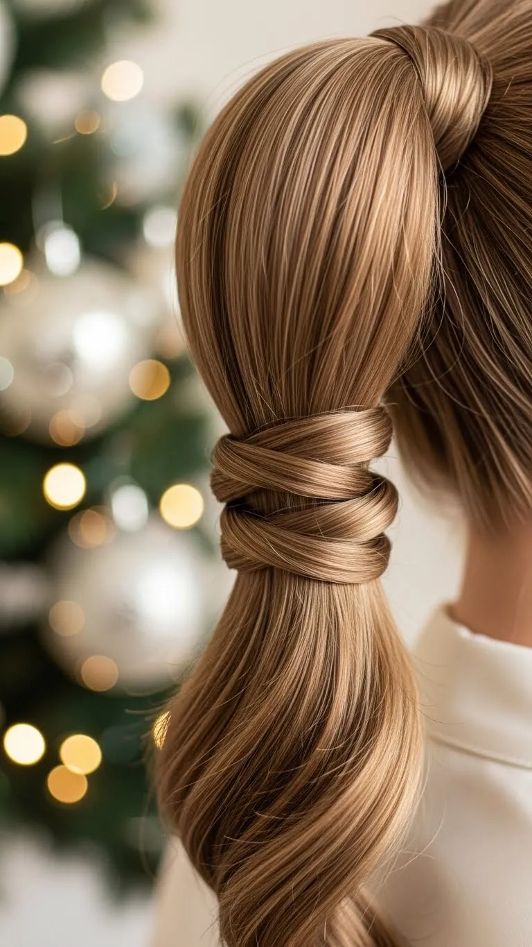 Make a mid-height ponytail. Take two small pieces from the front and twist them back toward the ponytail. Wrap them around the base. Pin the ends underneath. This hides your hair tie and gives the ponytail a styled look. Curl the ends if you want more movement. You can also add a small gold clip behind the ponytail. It keeps the style simple but festive. Works well for kids, teens, and adults.