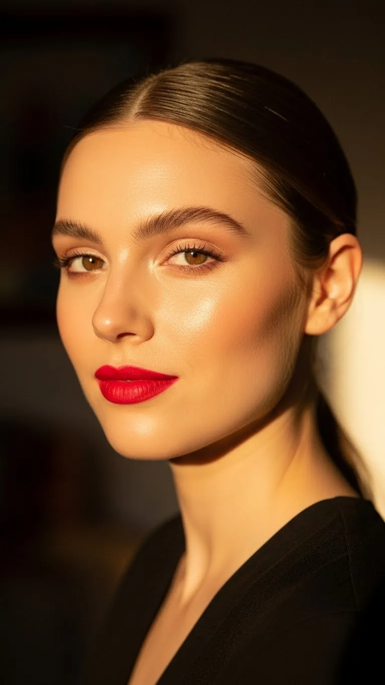 Red lips are a statement, so let them shine without competition. Think polished, not overdone.