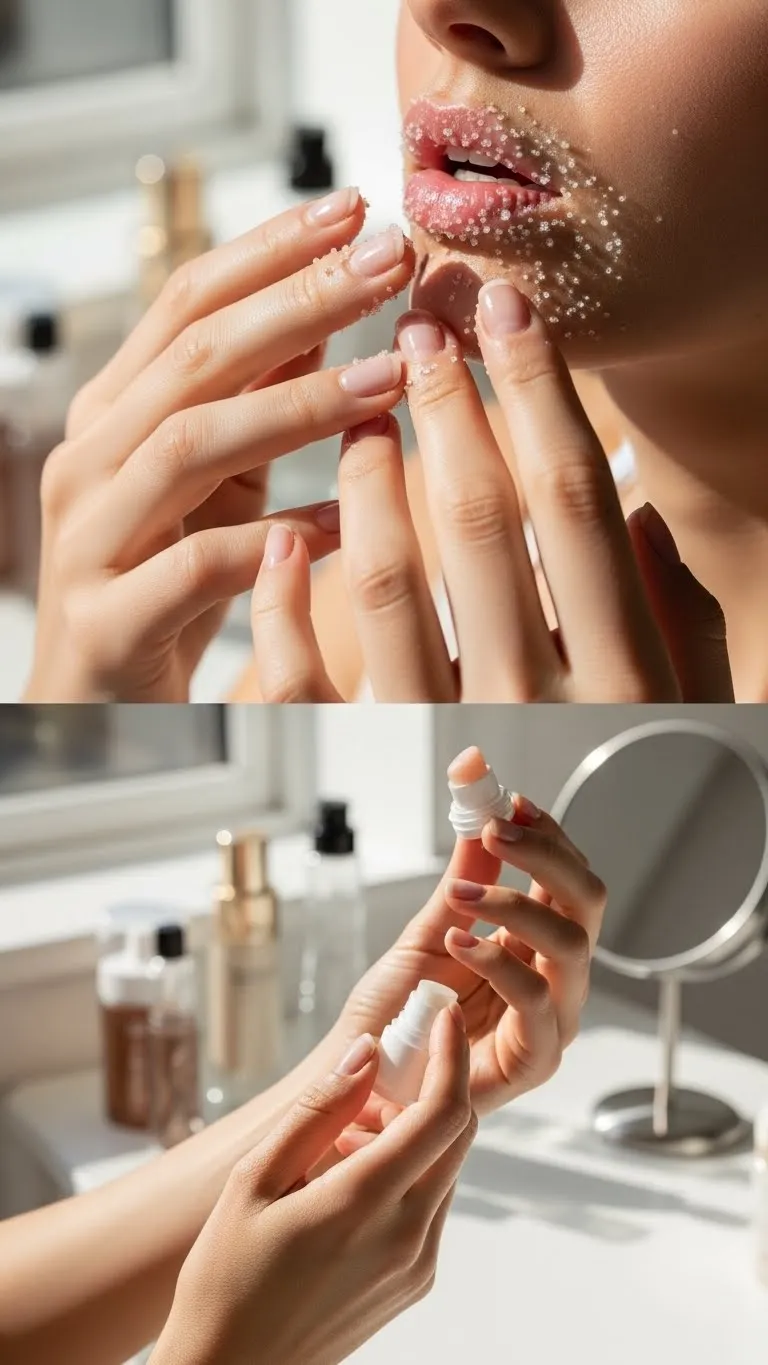 - Gently exfoliate with a lip scrub or a damp washcloth