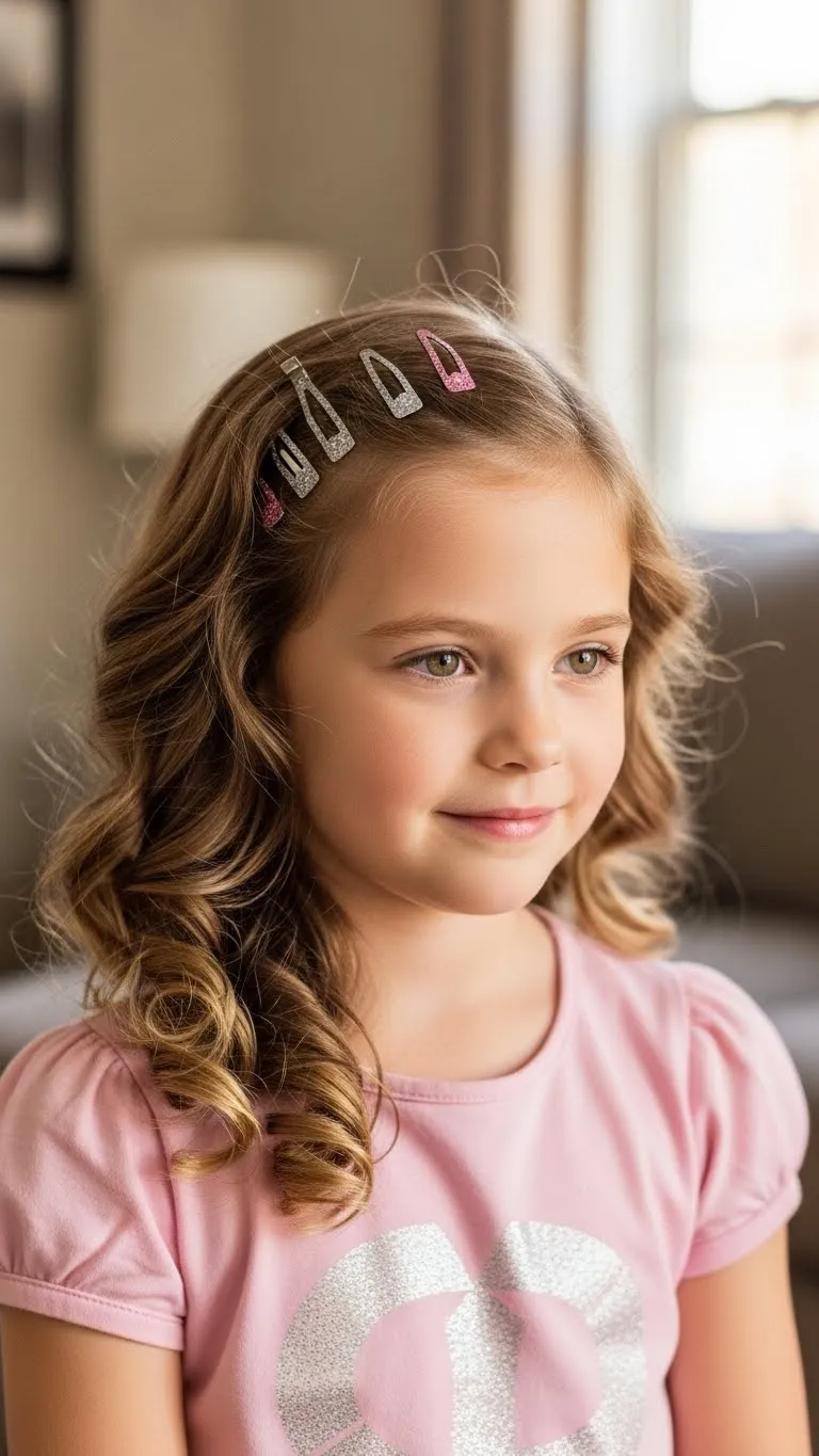 Side-swept waves are gentle and chic. Curl hair loosely and sweep it over one shoulder. Pin back a small section for extra hold. Add tiny sparkly clips for holiday cheer. Works on medium to long hair and takes under 10 minutes. Budget tip: use hairpins you already own and add DIY glitter accents. Comfortable for active kids and looks perfect in photos.