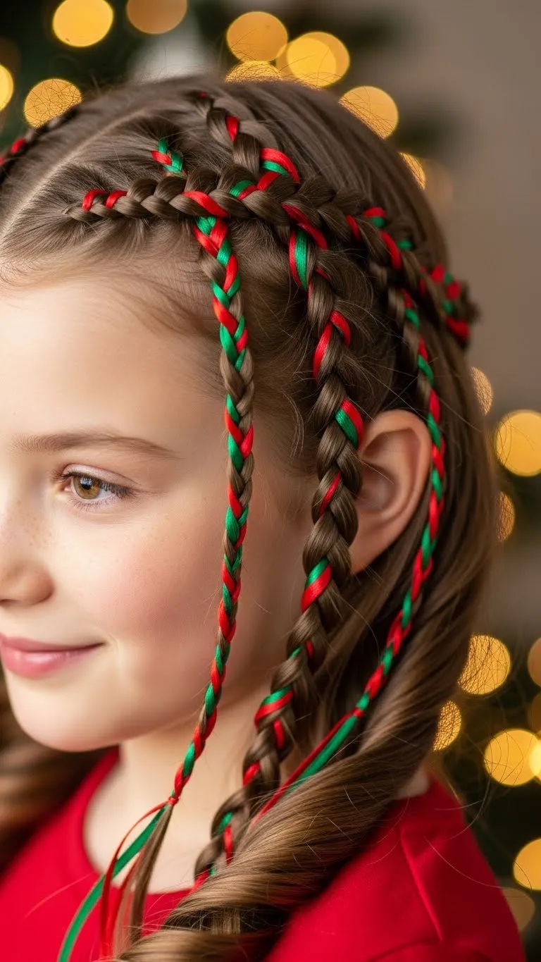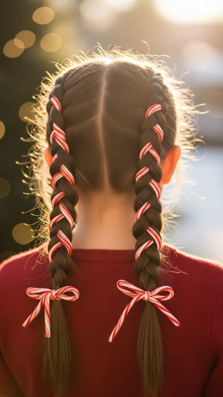 Candy cane twists are fun and thematic. Twist two small sections of hair and weave in red and white ribbons. Pin back ends with small clips. Quick, under 10 minutes, and perfect for parties. Budget-friendly: use leftover ribbons from holiday gifts. Kids love the playful holiday vibe, and it works on short to medium hair.