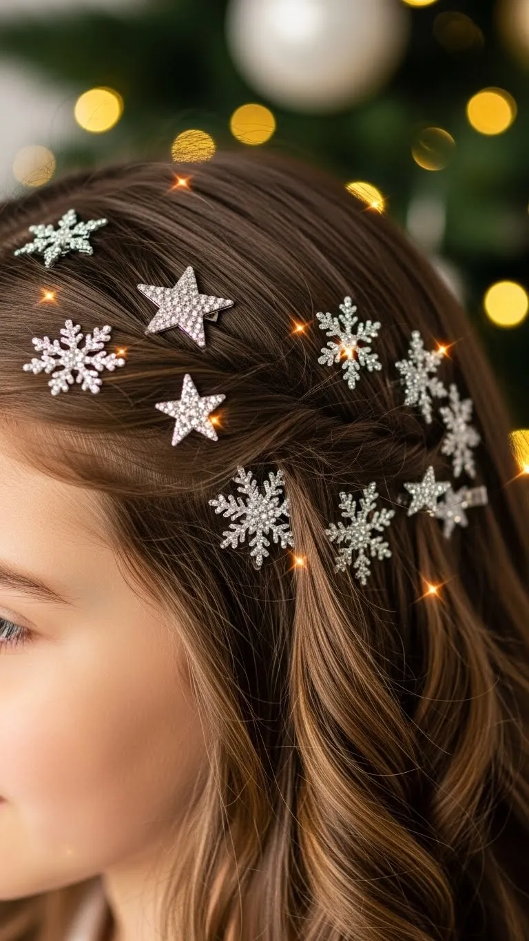 Adding glittery hair pins instantly transforms any hairstyle. Pin a few along bangs, side sections, or a braid. Takes under two minutes and adds a festive touch without fuss. Budget tip: purchase packs of inexpensive clips or make DIY glitter pins. Works on all hair lengths and can complement any existing style.