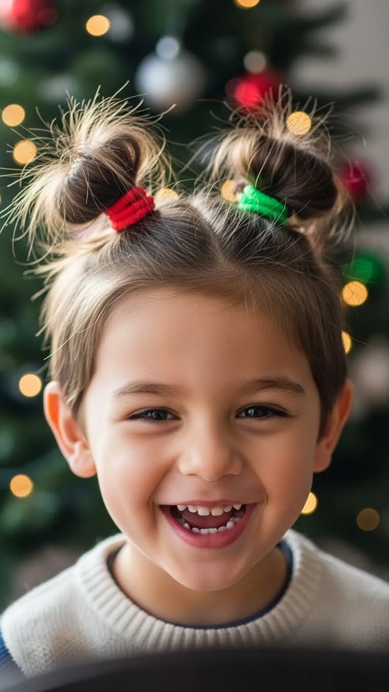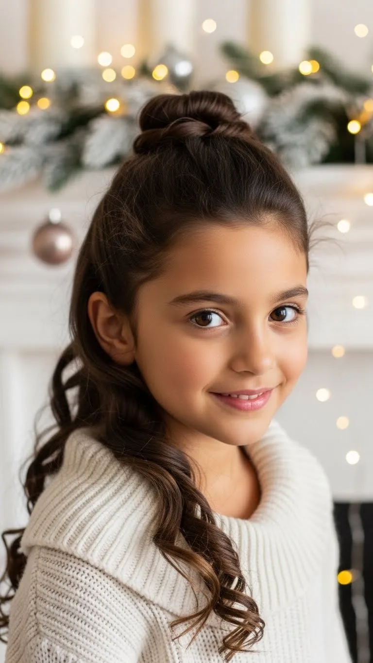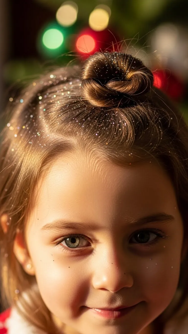 The festive top knot is effortless. Gather hair into a high bun and secure with an elastic. Add small ornaments or sparkly clips inside the bun. Loose strands frame the face for a soft look. It’s perfect for active kids who need hair out of the way. This style is quick, taking under five minutes, and you can use hair ties you already own. Optional: apply a tiny glitter spray for extra holiday sparkle.