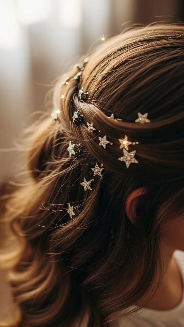 Star clips add charm to any simple style. Sweep hair to one side and pin small star clips along the front or side. Takes under five minutes. Budget-friendly: DIY from craft materials or buy inexpensive packs. Works with straight, wavy, or curly hair. Perfect for quick school or party styling with minimal effort.