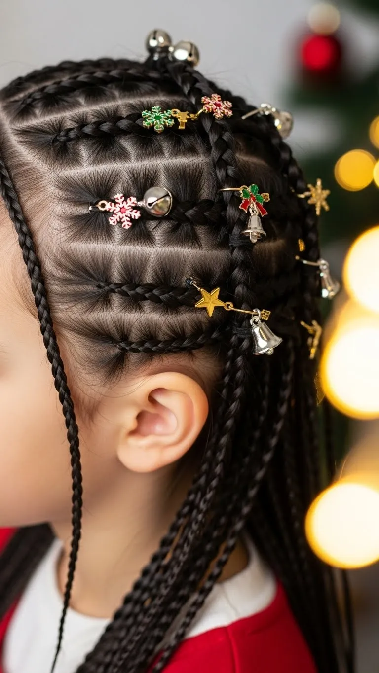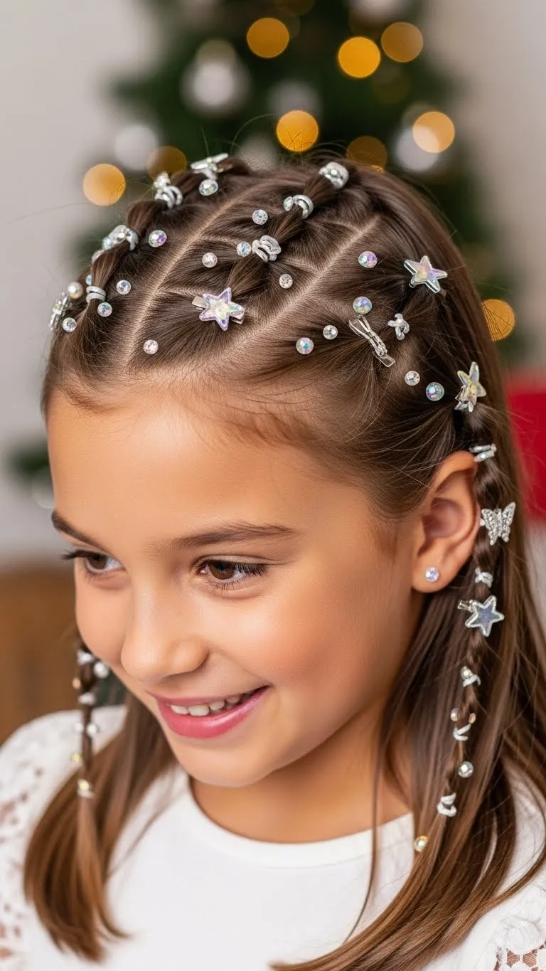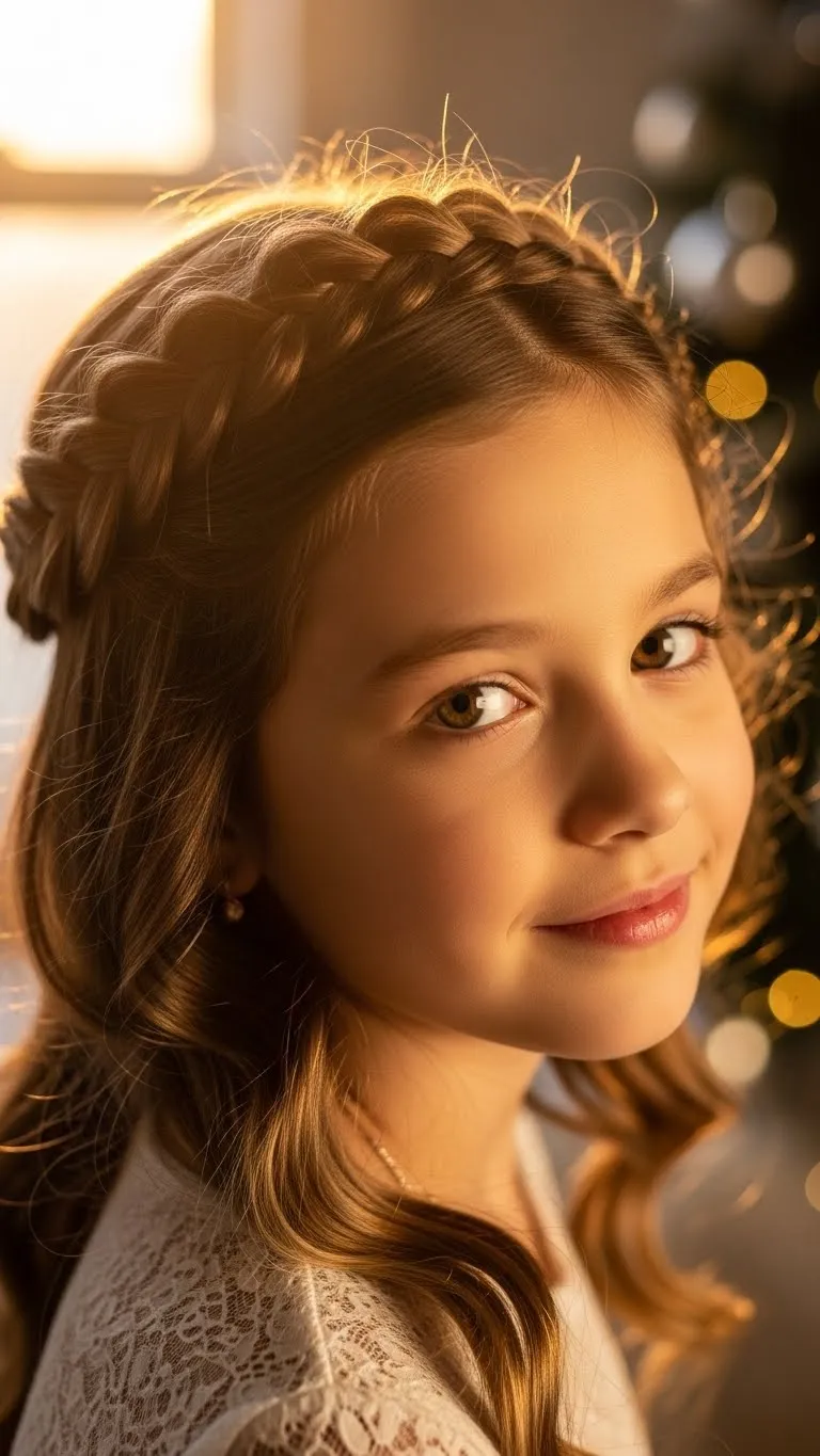 A braided crown adds a touch of elegance while staying practical. Create two small braids along each side of the head and pin them across the crown. It keeps hair away from the face and is perfect for active kids. For a festive touch, weave in thin red or green ribbons. This style looks complicated but takes just 10 minutes. Budget-friendly tip: use basic hairpins you already have and sprinkle in some glitter hairspray for sparkle.