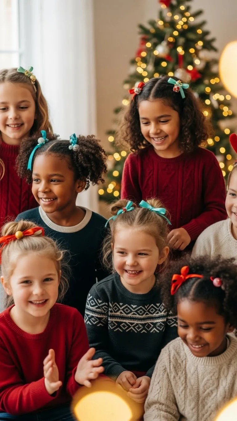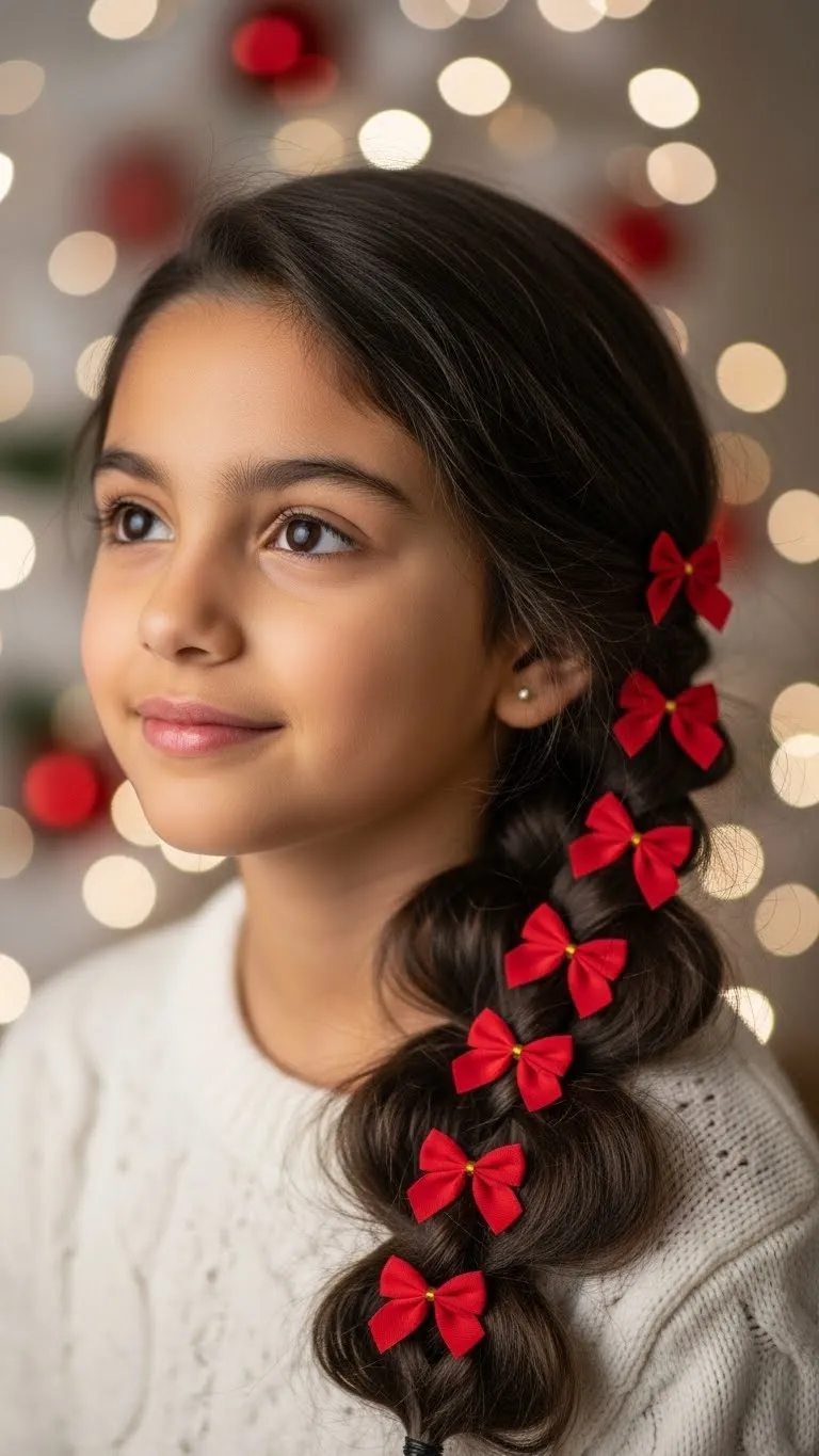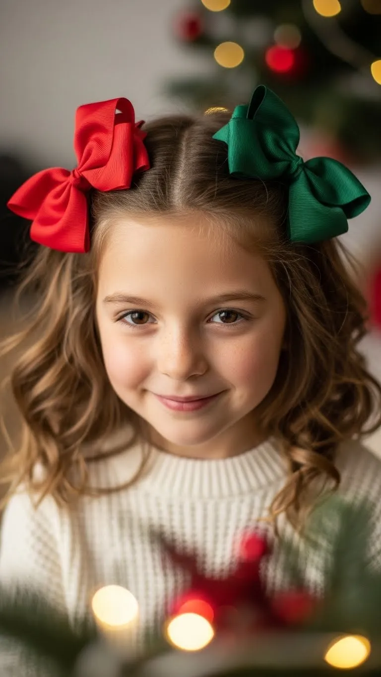 Bow clips instantly add holiday spirit. Simply clip festive bows on either side of the head. Works with any hair length or style. This style is quick, taking less than two minutes, and avoids the need for complex styling. Budget-friendly tip: buy packs of inexpensive bows or make DIY bows with ribbon scraps. Kids can help choose the bow colors, making styling fun and interactive.