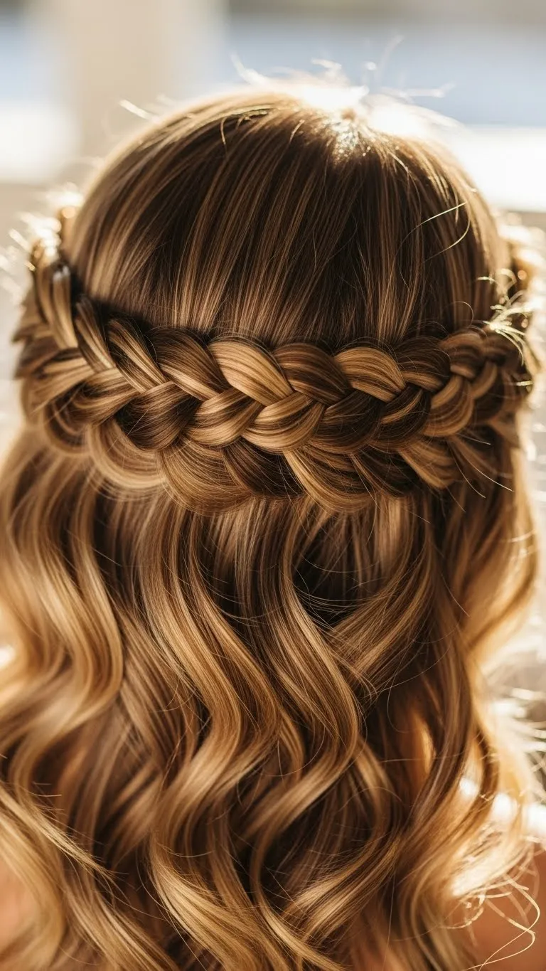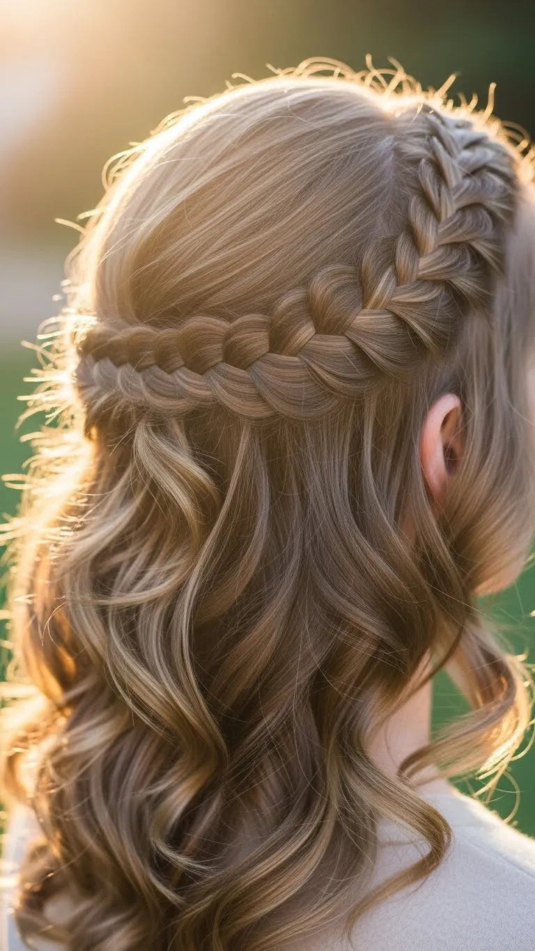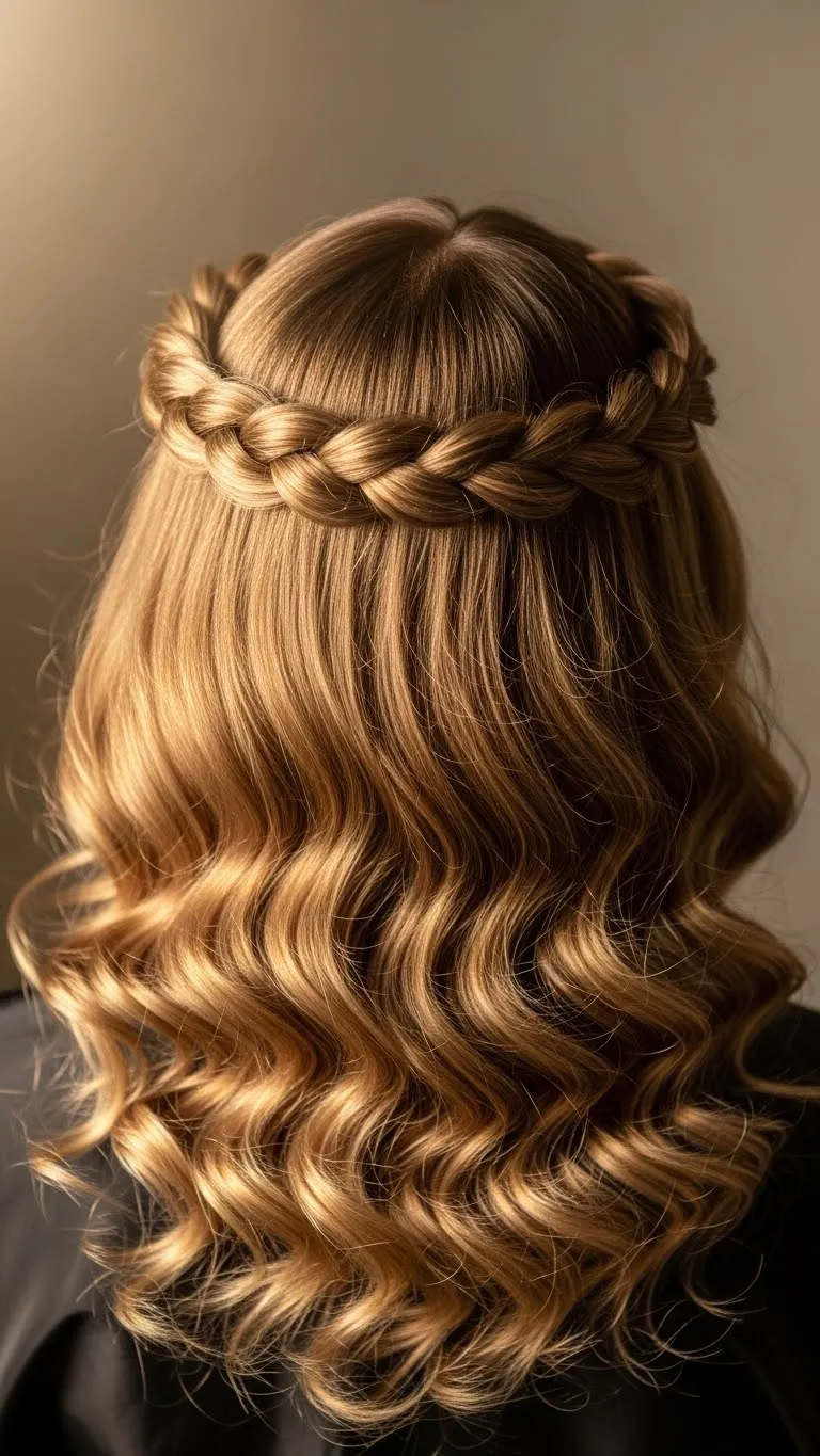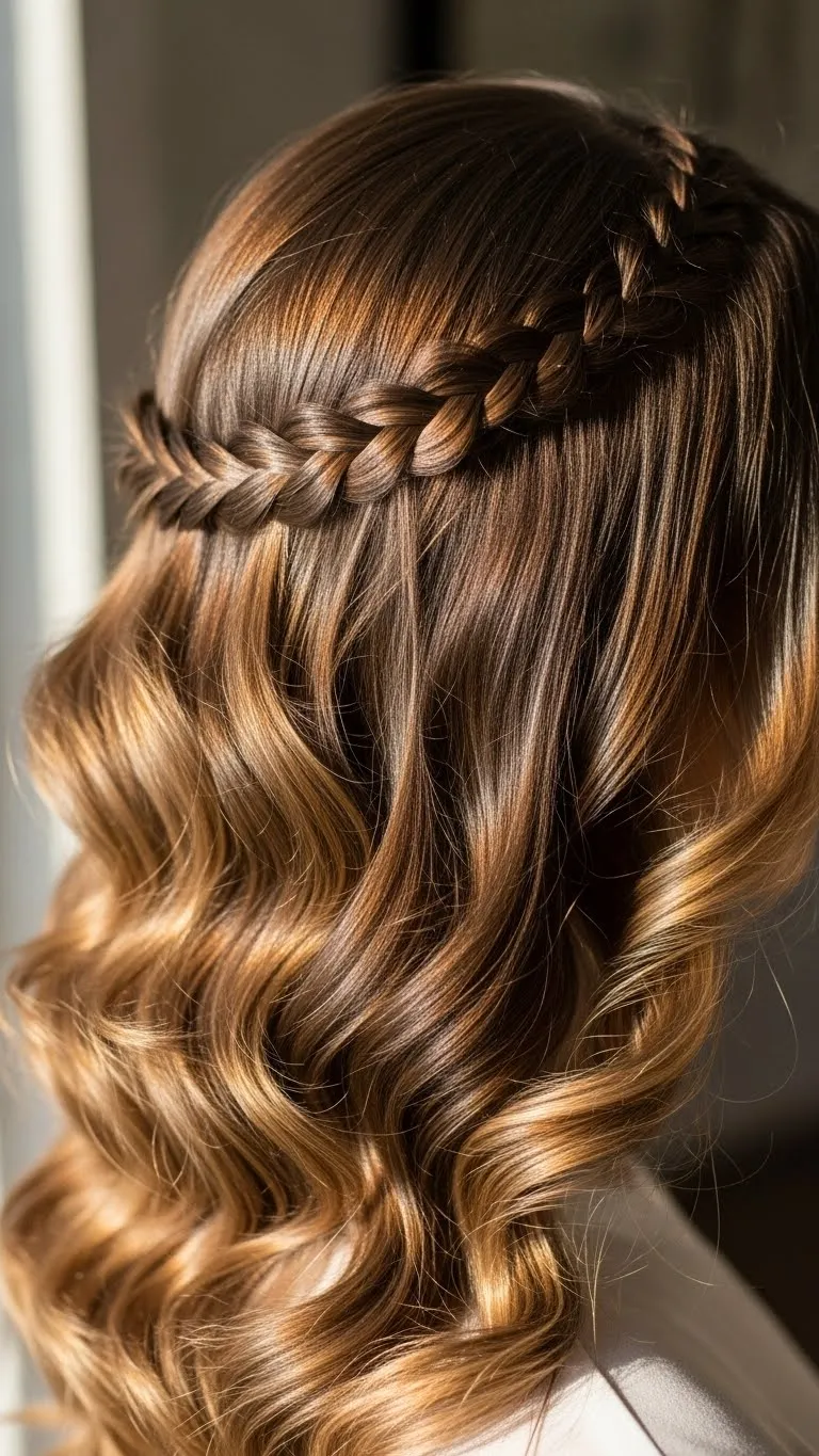 A braided crown adds a fairy-tale feel to soft curls. Curl your hair first, then braid two sections from each side and pin them across the top of your head. Loose curls underneath frame the face naturally. If you’re on a budget, simple braids secured with bobby pins can create the same look without professional help. This style is ideal for weddings, dates, or festive events. Adding small flowers or delicate accessories can make it even more charming. It’s a style that balances structure and softness effortlessly.
