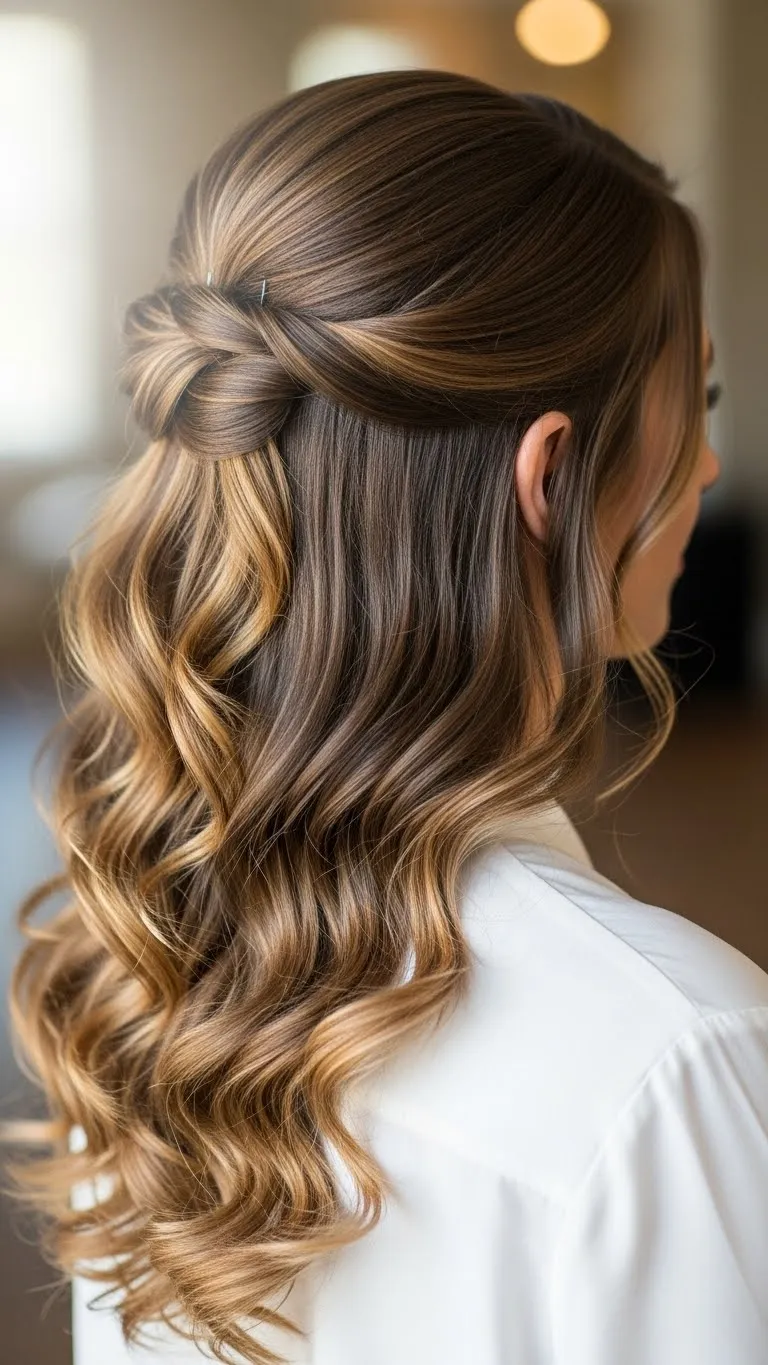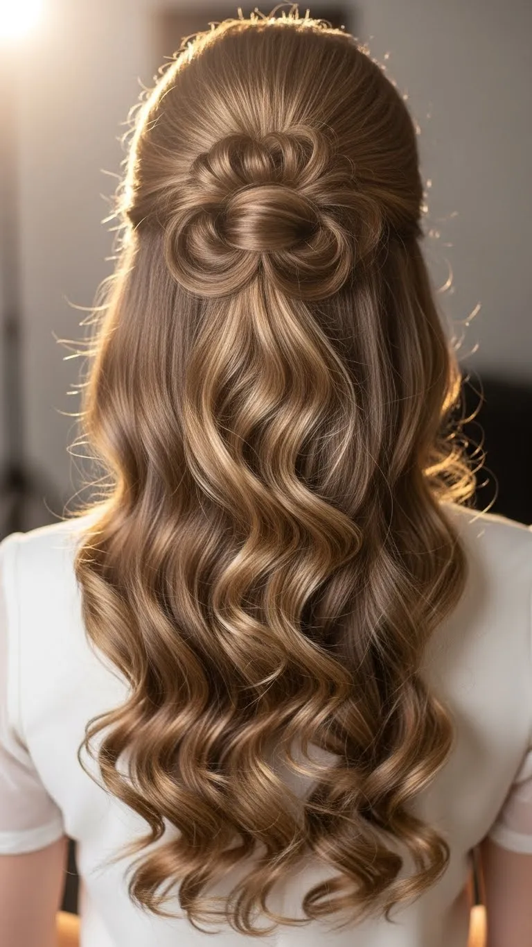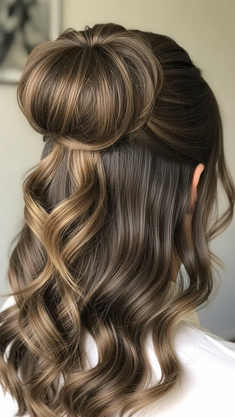 The half-up bun mixes casual and formal elements. Curl your hair first, then take the top half and form a bun. Leave the bottom curls loose for softness. This style works for all hair types and lengths. For a DIY option, use hair ties and pins you already have. Adding a decorative scarf or clip can give it a unique flair. It’s a practical, romantic choice for any day, keeping hair off your face while showcasing your curls.