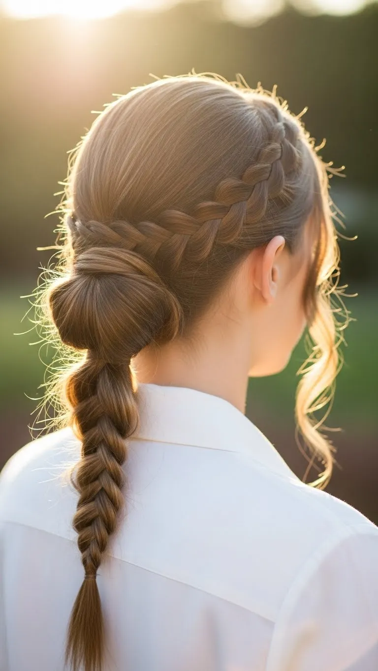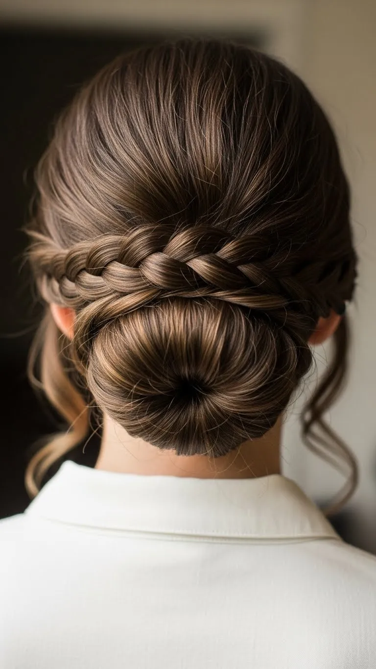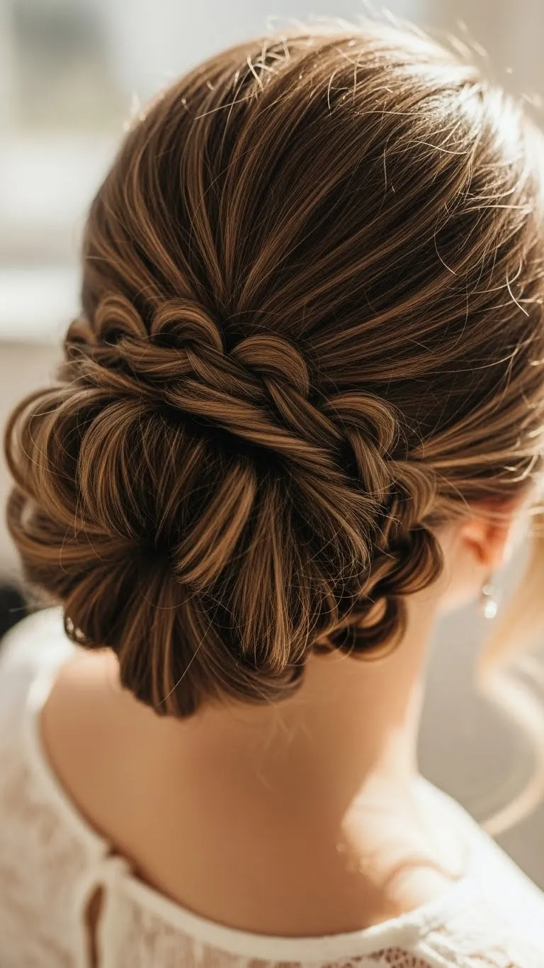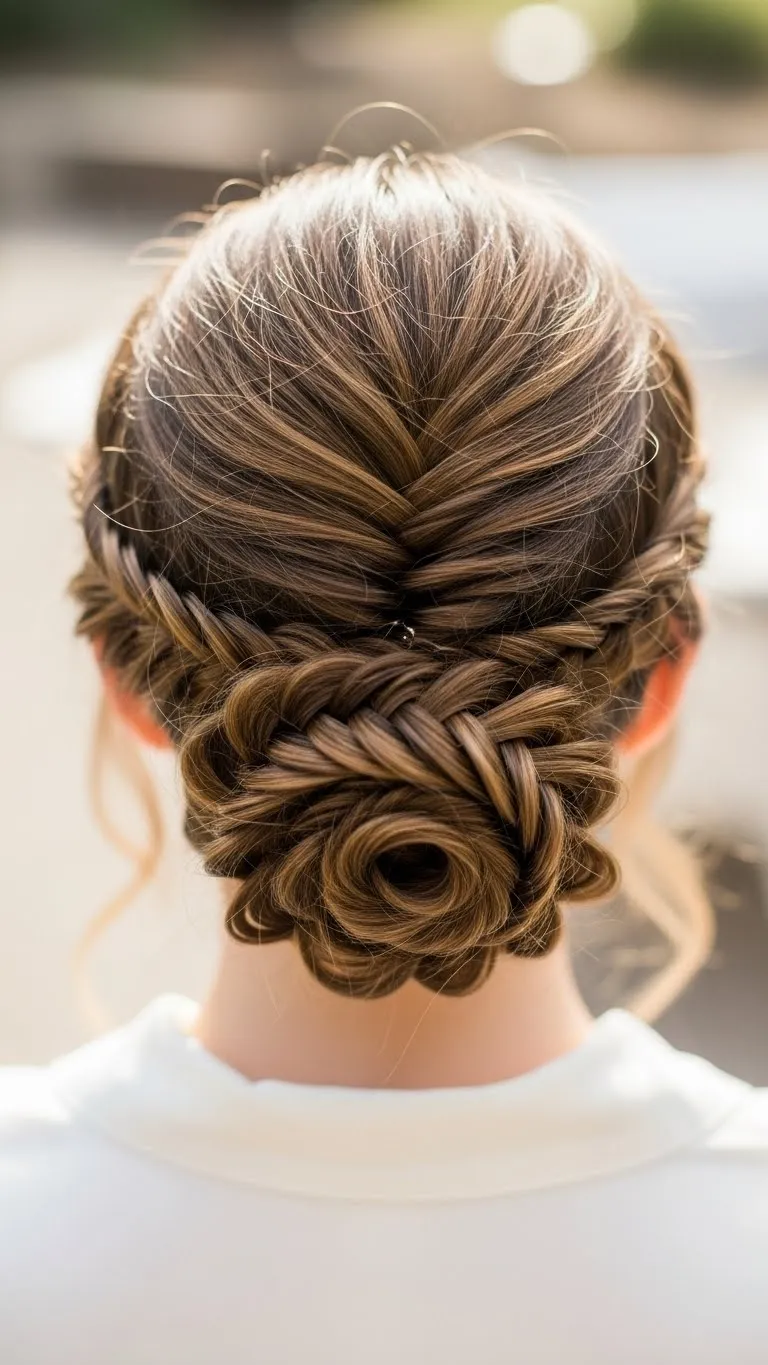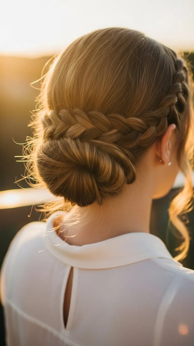 The low braided bun is chic, practical, and easy to recreate at home. Begin by braiding a section of your hair and wrapping it into a low bun at the nape of the neck. Secure with bobby pins or a small elastic, and pull a few strands loose to soften the look. This hairstyle works best on medium to long hair and flatters many face shapes. Add small decorative pins, flowers, or hair clips to elevate the style for weddings, parties, or casual events. Teasing the crown slightly adds volume and enhances the romantic feel. For fine hair, using a texturizing spray gives grip and fullness. This updo is beginner-friendly and requires minimal tools—just pins, elastics, and hairspray. The low braided bun combines elegance with simplicity, making it ideal for both casual and formal occasions. Its beauty lies in the blend of structured braiding and loose strands, creating a romantic, soft style that looks intricate but is surprisingly easy to achieve.