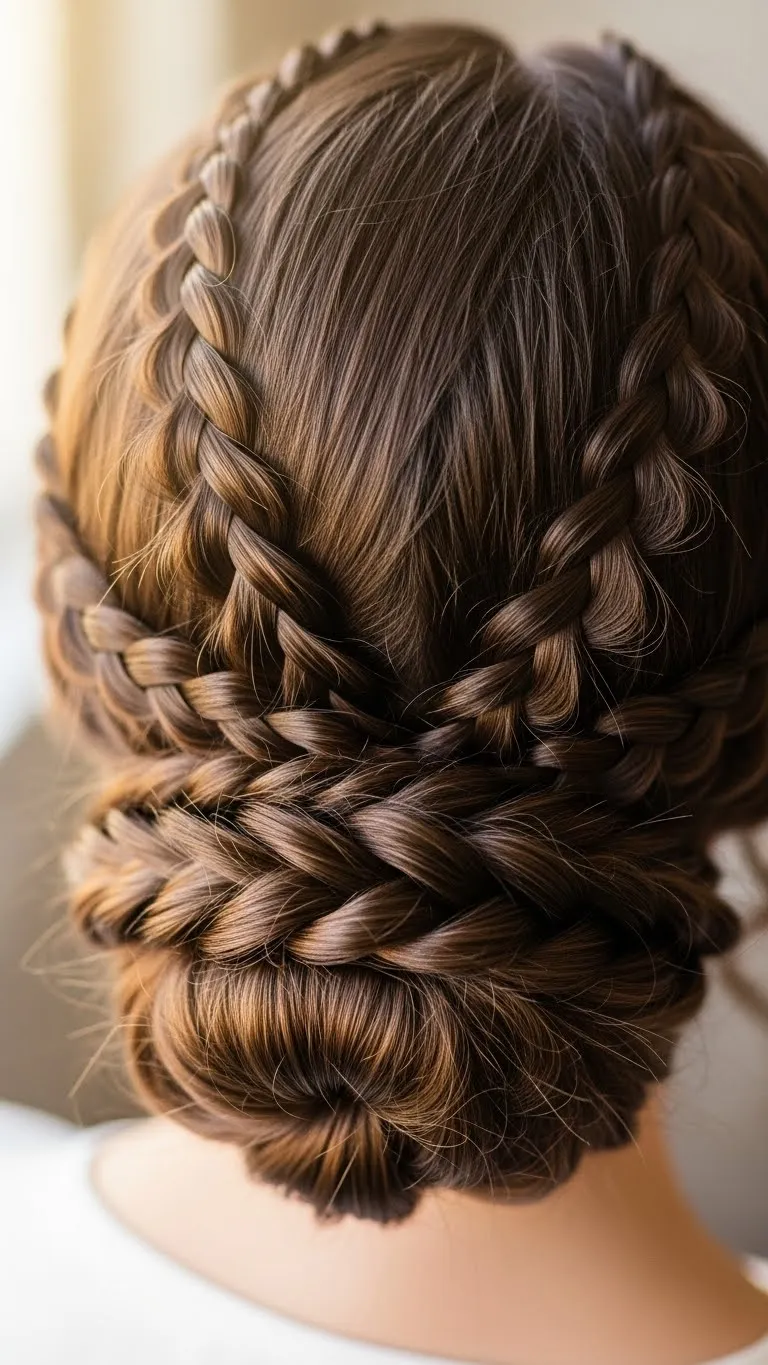 The double braided updo is playful, romantic, and surprisingly versatile. Start by braiding two sections of hair from either side of your head, then wrap both braids together into a low bun at the back. Secure the bun with bobby pins or small elastics and let a few strands fall softly around the face to maintain a romantic feel. This hairstyle works best on medium to long hair and is suitable for casual outings, parties, or semi-formal occasions. You can enhance the look with small clips, decorative pins, or fresh flowers for special events. Light teasing of the crown adds volume and prevents the style from looking flat. For fine hair, a texturizing spray gives grip and helps the braids hold longer. The double braided updo looks intricate but is simple to achieve with basic tools, making it perfect for DIY styling. Its charm comes from combining structured braids with soft, loose strands, creating a style that feels sophisticated yet approachable. Whether you’re attending a wedding or enjoying a casual day out, this updo adds a delicate, romantic touch.