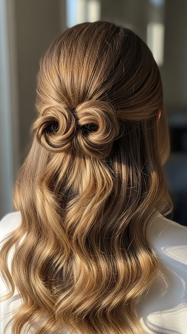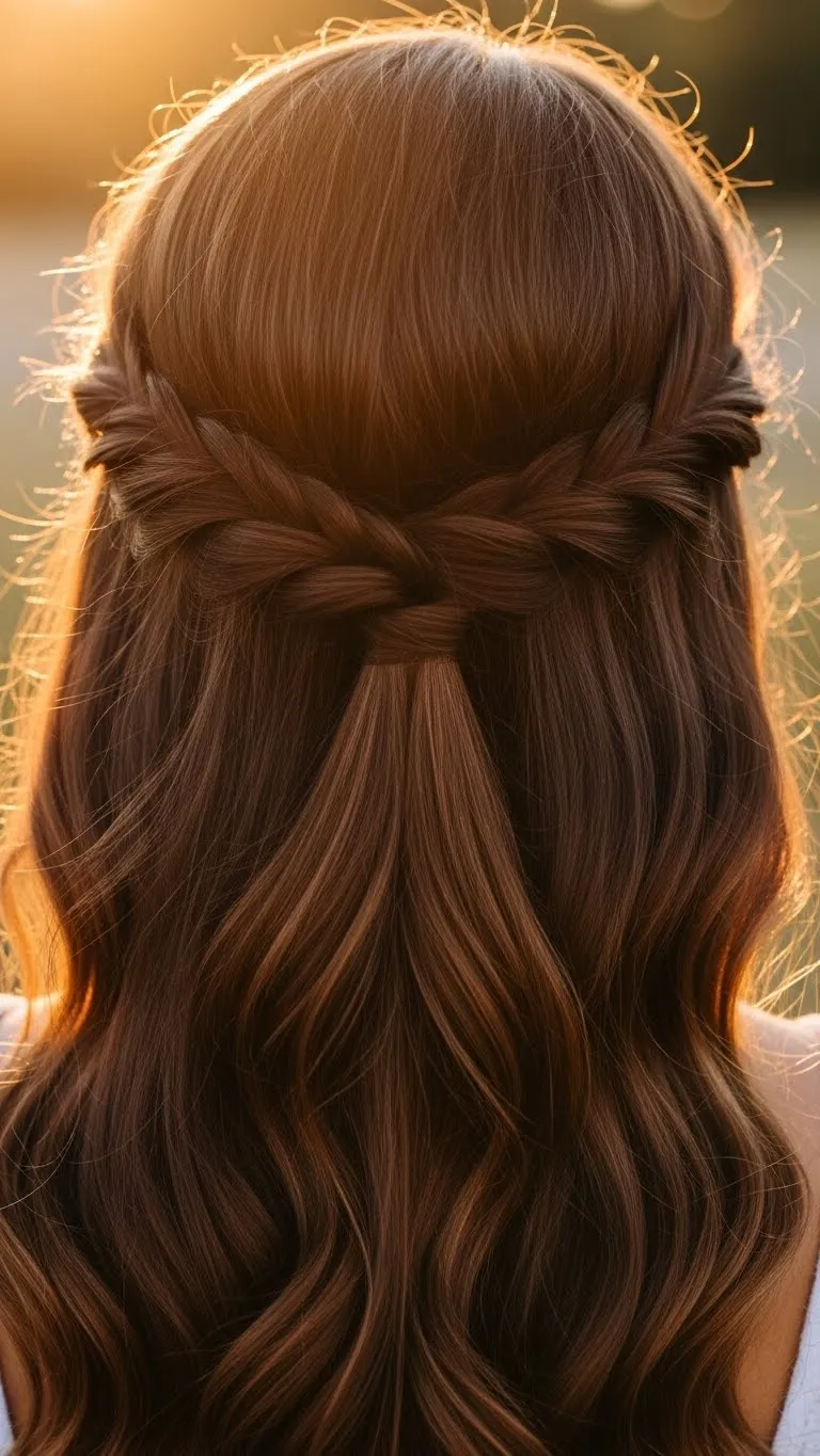 The knotted half-up is an easy, romantic hairstyle that gives a soft, feminine appearance while keeping hair partially down. Begin by taking two sections from either side of your head and loosely knotting them together at the back. Secure with pins or a small elastic and let the rest of your hair flow freely in soft waves. This style works beautifully on medium-length hair and is ideal for casual brunches, date nights, or semi-formal events. The soft waves around the face add movement and frame features naturally. For extra charm, add a small hairpin, ribbon, or flower along the knot. Beginners can create this look easily by taking small sections and securing them with a few pins. A light hairspray will keep the knots in place while preserving softness and natural flow. The knotted half-up is a quick, versatile option that combines structure and softness, giving a polished yet effortless appearance. Its relaxed elegance makes it perfect for everyday wear or special occasions without requiring complicated styling tools.