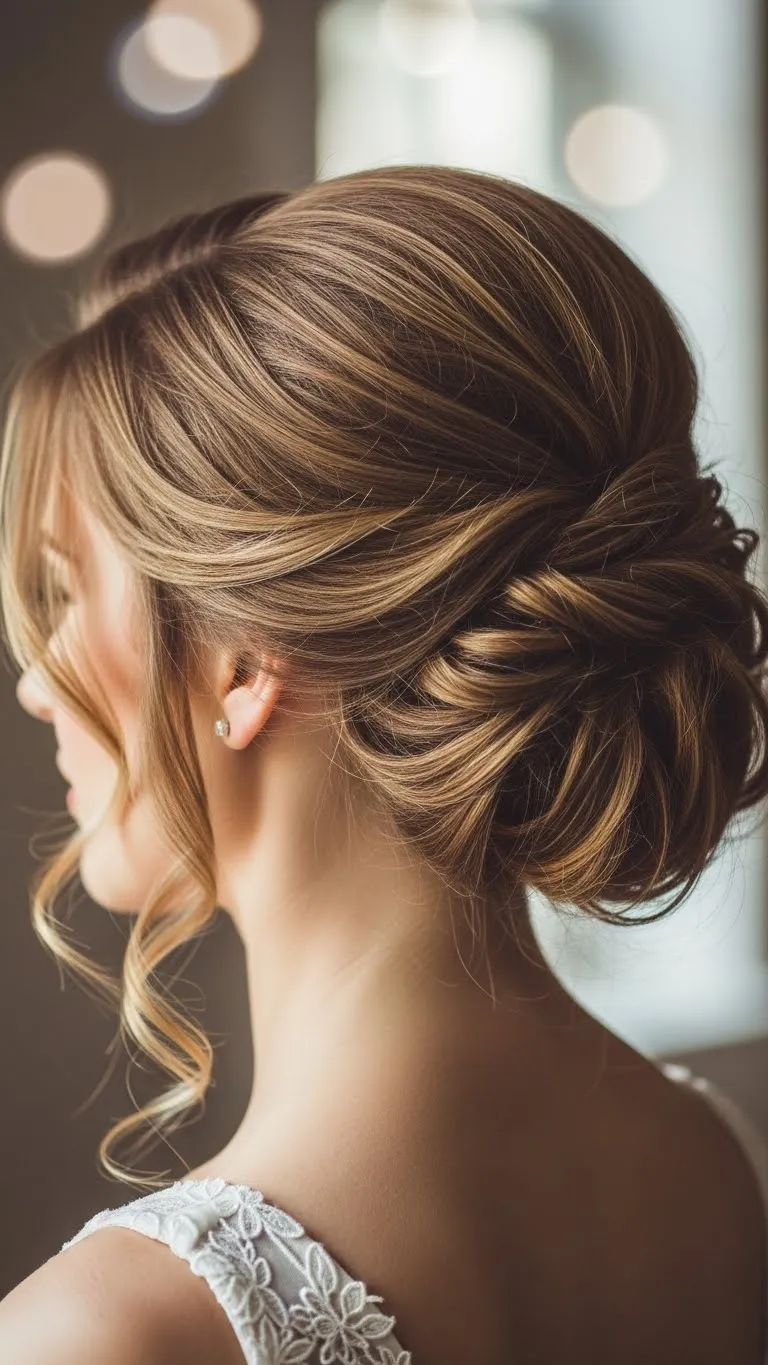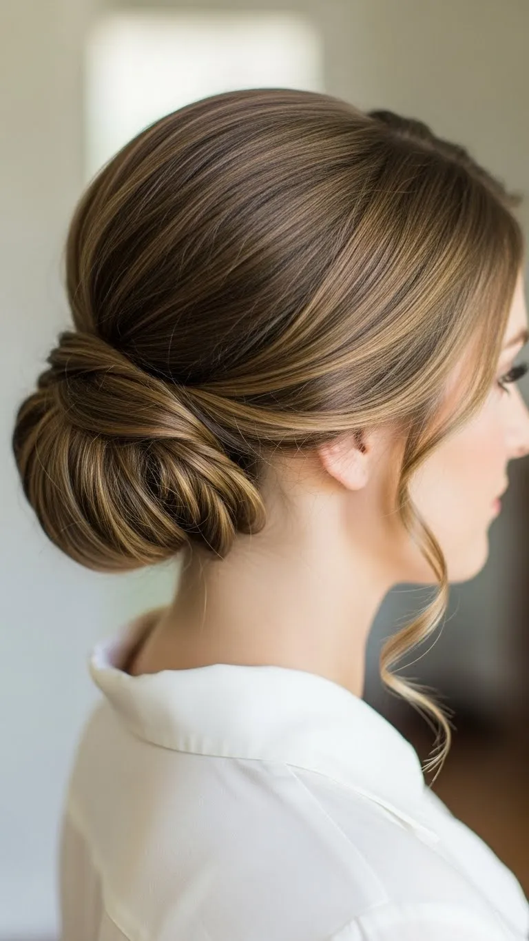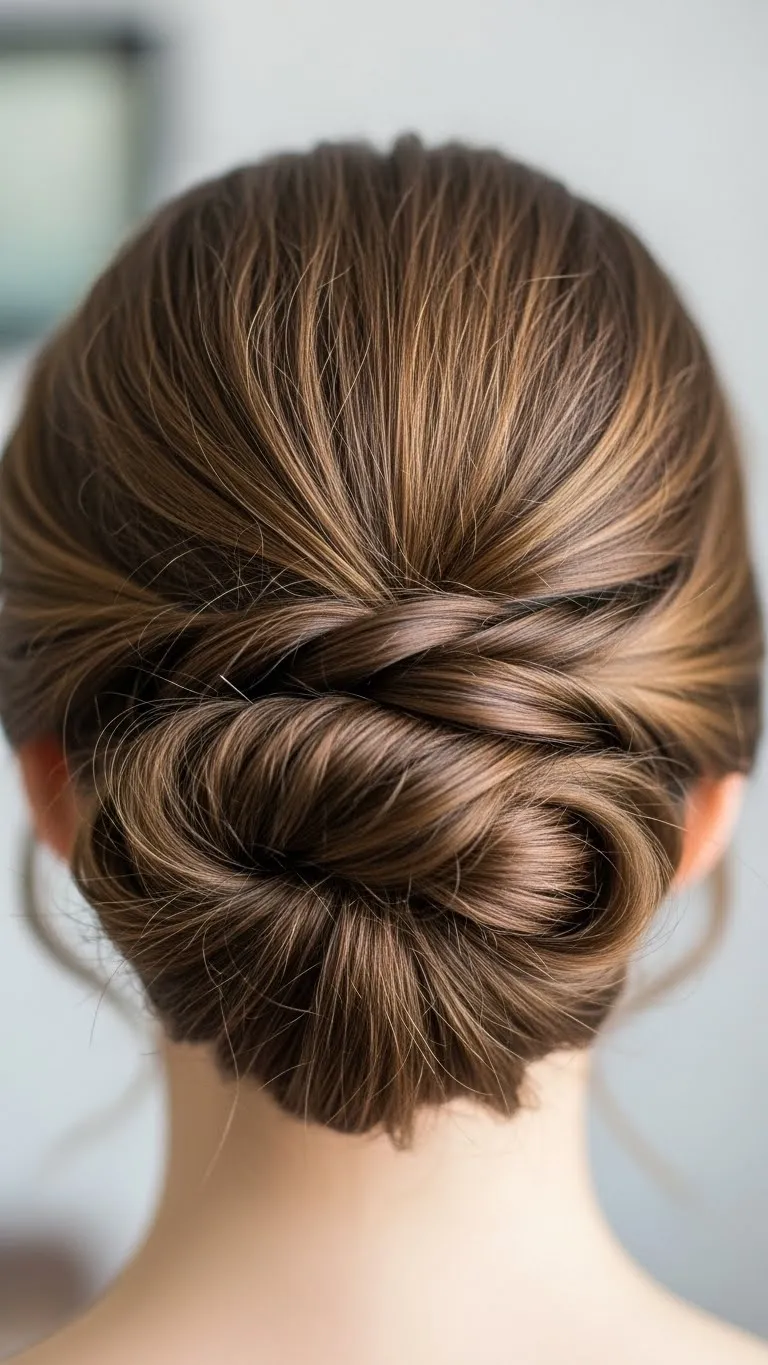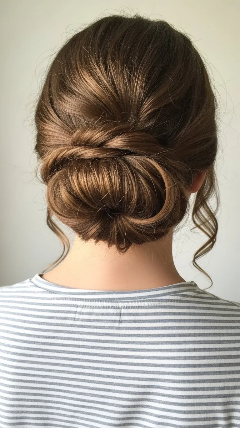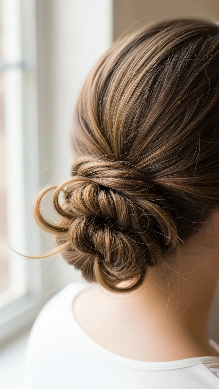 A loose chignon with twists is effortless, romantic, and perfect for a range of occasions. Start by gathering your hair into a low bun, then create small twists with sections around the bun and pin them in place. Let a few soft strands fall around your face to frame it naturally. Works best with medium-length hair, but long hair can be tucked or rolled for additional volume. You can accessorize with decorative pins, small flowers, or clips to add charm. A light teasing of the crown can provide subtle height and texture. This style is ideal for both casual events and formal gatherings because it strikes a balance between polished and relaxed. A budget-friendly DIY tip is to use hairpins you already own and finish with light hairspray to hold everything in place. The loose chignon with twists combines softness and sophistication, making it an excellent option for anyone who wants a romantic, effortless updo that looks intricate but is simple to recreate at home.