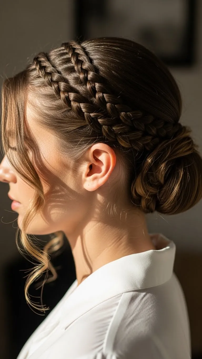 The braided crown updo is regal, soft, and ideal for adding a feminine touch. Begin by creating two small braids from either side of your head. Wrap the braids around your crown and secure them with pins at the back. Leave a few strands loose to create a soft, romantic effect around the face. This hairstyle works beautifully on all hair types, whether your hair is fine, thick, or wavy. For added flair, try incorporating thin ribbons or delicate beads into the braid. The braided crown is excellent for outdoor events, brunches, or photoshoots. You don’t need professional tools; basic pins and a comb can help shape the braid neatly. To add volume, lightly tease the roots before braiding. This gives the updo a slightly lifted, natural look without stiffness. The best part is that it looks intricate, but it’s relatively simple to achieve at home. With a little patience and pins, you can create a soft, elegant crown braid that feels both effortless and timeless, making you feel like royalty at any event.