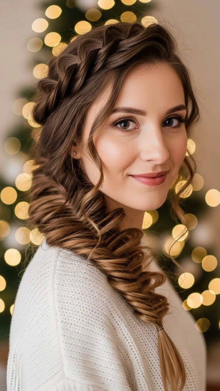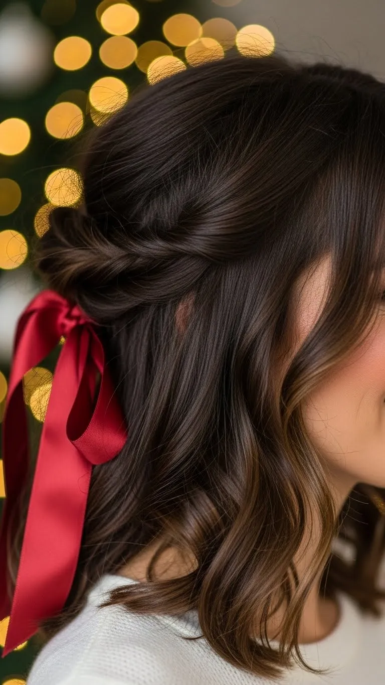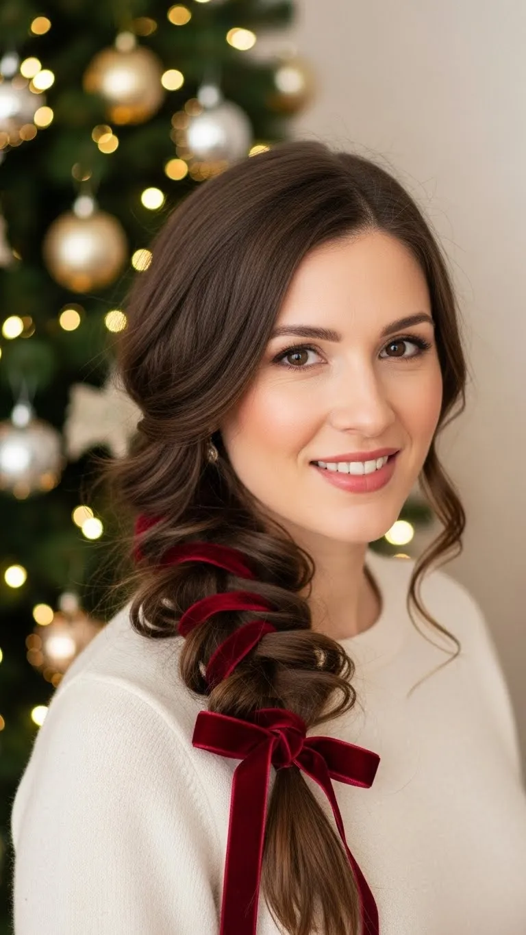 A side braid with ribbon is charming and simple. Braid hair loosely to one side, weave a ribbon through or tie at the end. Works on medium and long hair and adds a playful holiday touch. Quick to create and can be combined with loose waves. Budget-friendly and festive.