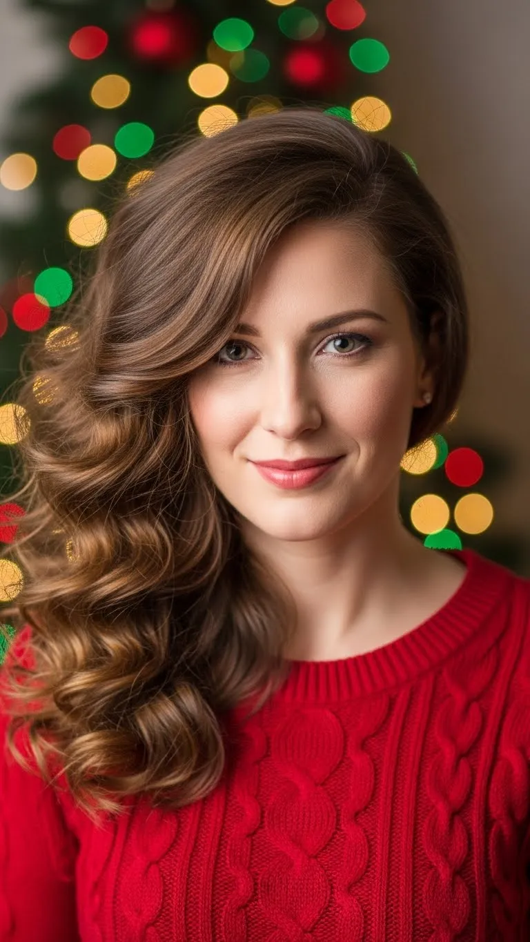 Side-swept curls create a glamorous vibe effortlessly. Curl hair loosely, then sweep it to one side. Pin with bobby pins if needed and add a sparkly clip. Works well for medium and long hair and can be paired with a festive outfit. Minimal products are needed—just a curling wand and light hairspray. Perfect for dinners, parties, or family gatherings.
