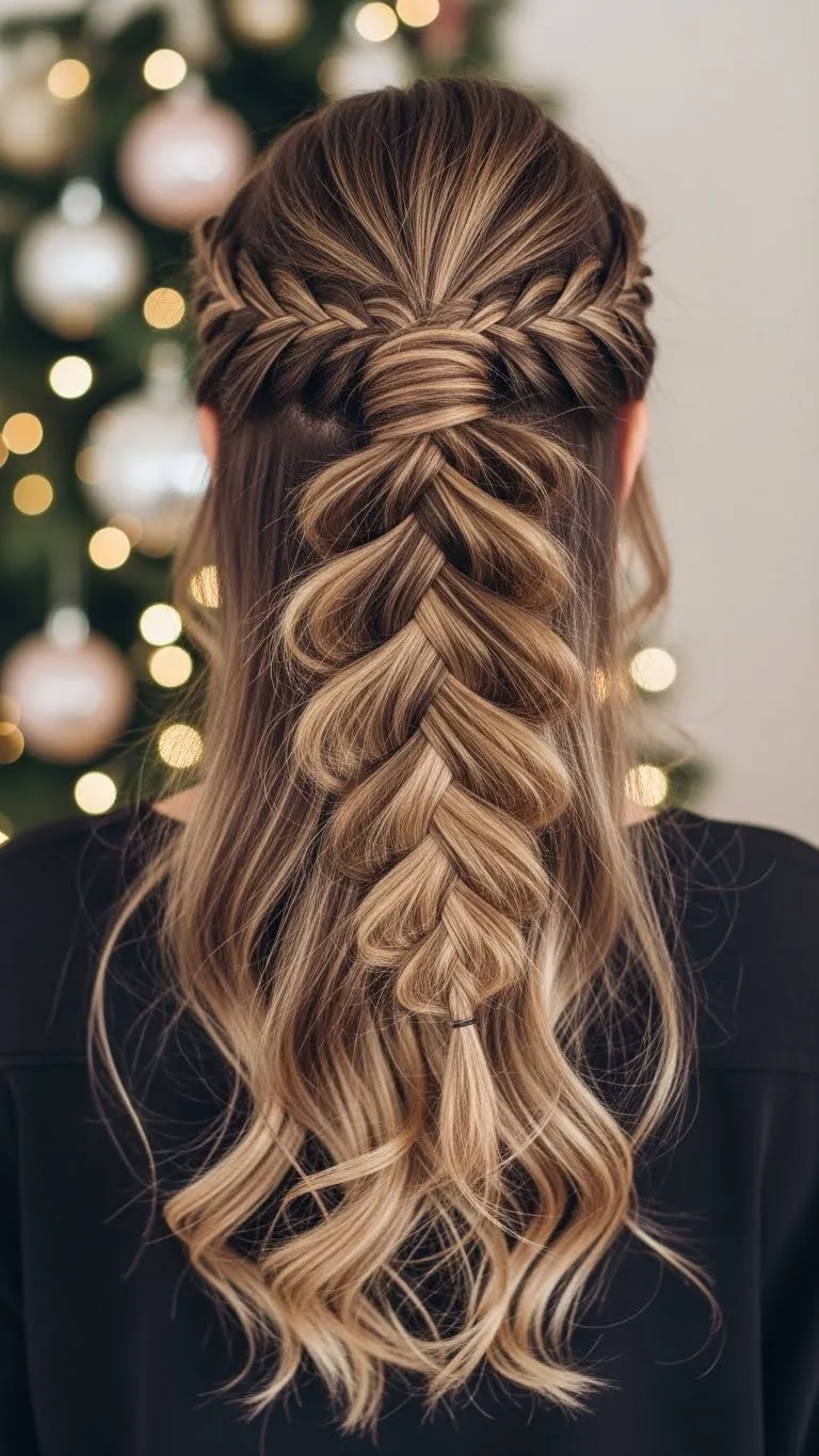 Combine braids and ponytails for a half-up braided ponytail. Take top hair sections, braid them, and tie with a hair tie. Leave remaining hair loose in waves. Works on medium and long hair, adding dimension and interest. Accessorize with small festive pins. This style is fun, youthful, and easy to create at home in minutes.