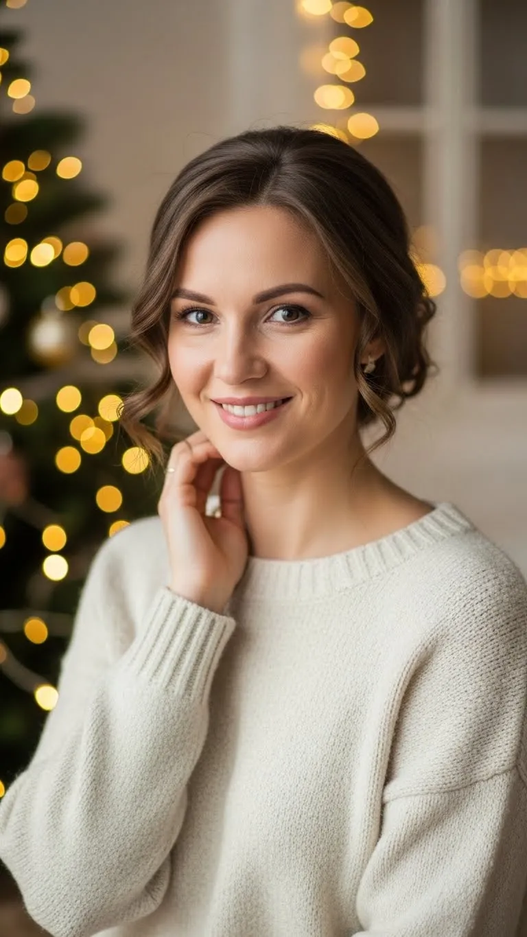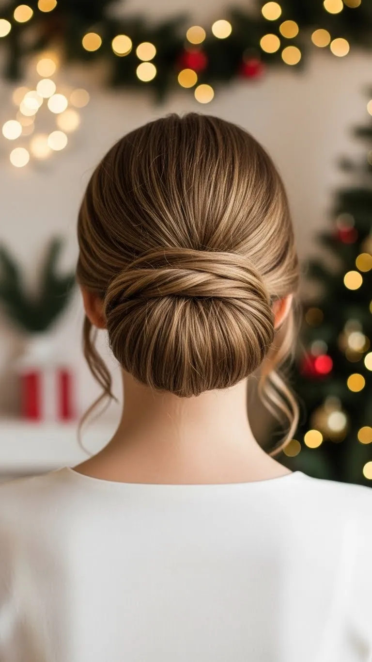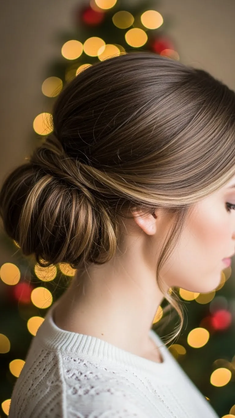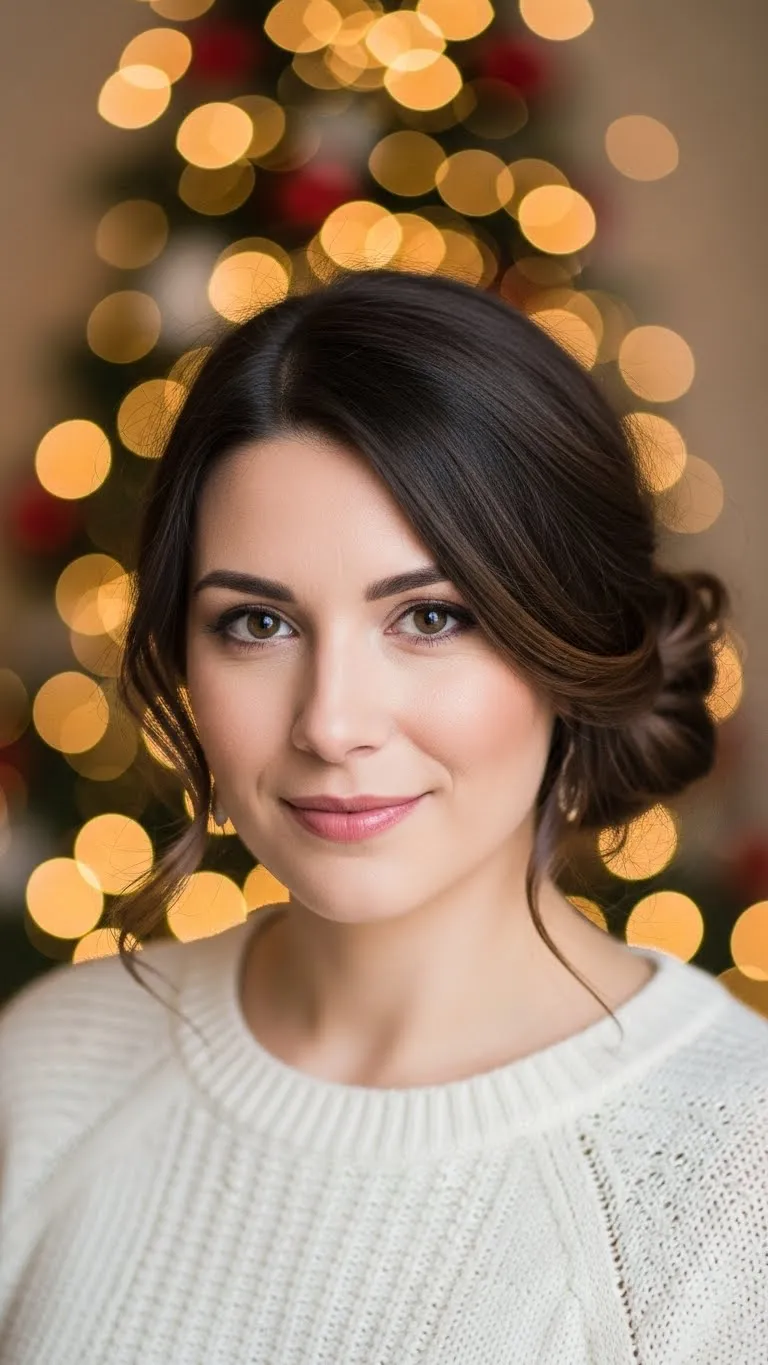 The low chignon is timeless. Gather hair at the nape, twist, and secure into a small bun. Add a decorative clip or barrette for holiday style. Works on medium to long hair and keeps the look clean and neat. Ideal for dinners or office events. Minimal effort but looks polished and chic.