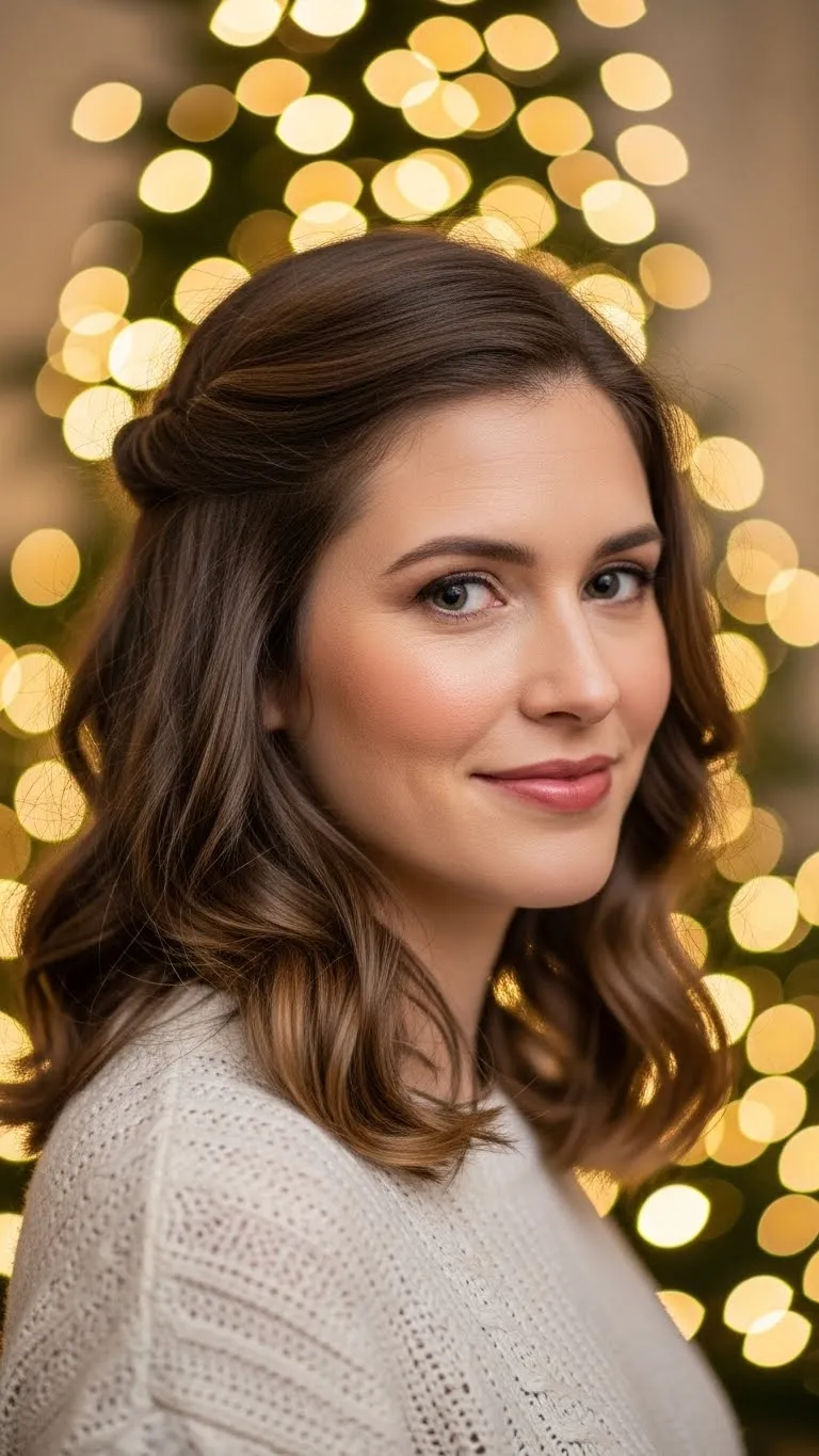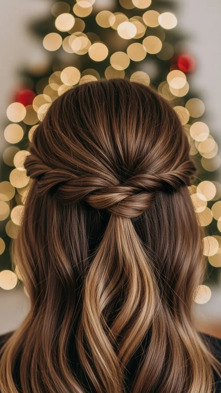 The twisted half-up hairstyle is perfect for a festive yet relaxed look. Start by taking two small sections from the front and twist them toward the back, securing with bobby pins. Tie a ribbon around the twist for a cute, seasonal touch. This style works on straight or wavy hair and adds instant charm. It’s easy to do at home and doesn’t require heat styling. You can choose metallic or velvet ribbons to match your outfit. Bonus tip: light hairspray keeps the twists in place all evening.