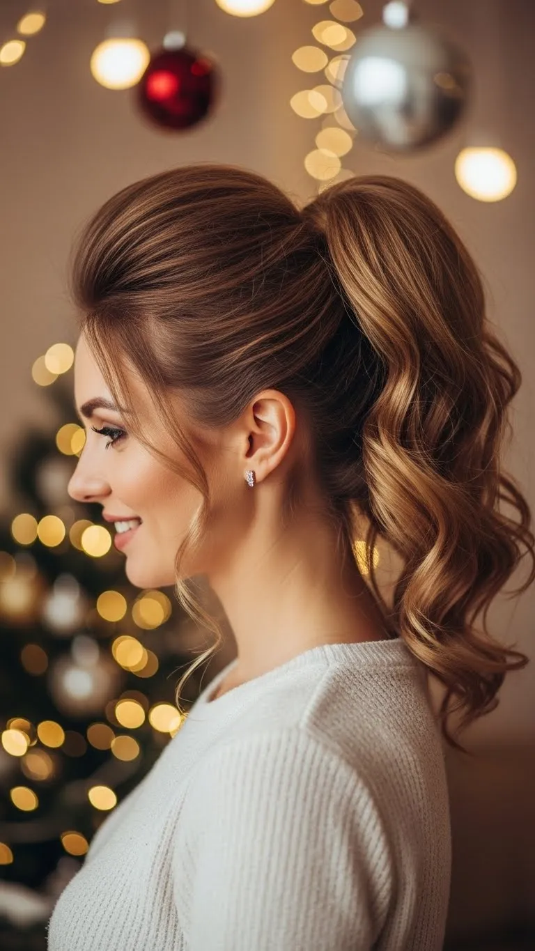 A loose ponytail with volume gives effortless chic. Tease the crown lightly, gather hair loosely, and tie with an elastic. Curl ends softly for a festive finish. Works for medium and long hair and requires minimal products. Accessorize with a small clip or festive ribbon for extra flair. Quick, casual, and stylish.