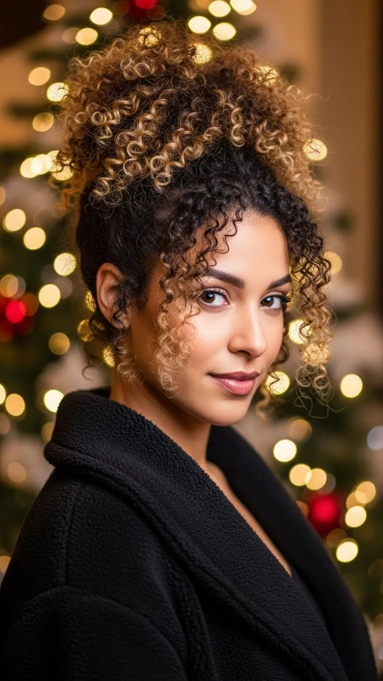 For natural curls, gather hair into a high puff ponytail. Secure with an elastic and fluff curls for volume. Works best with medium to long curly hair. Minimal tools needed—just hair tie and light hairspray. Add a festive bow or clip for holiday fun. Perfect for casual or semi-formal events.