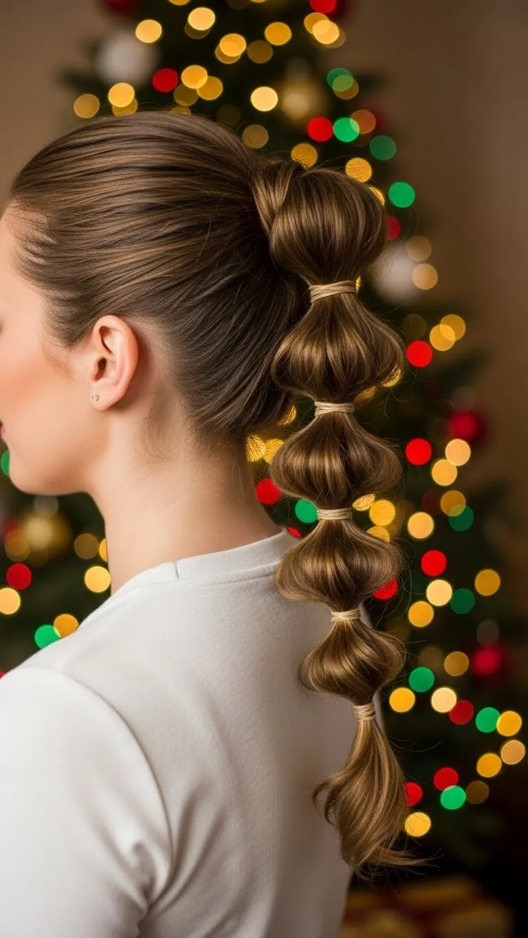 The bubble ponytail is a fun twist on a classic ponytail. Tie hair into a low pony, then add elastics every few inches, gently pulling to create “bubbles.” Works for medium to long hair and is playful yet chic. Add a festive hair accessory for Christmas charm. Quick, easy, and budget-friendly.