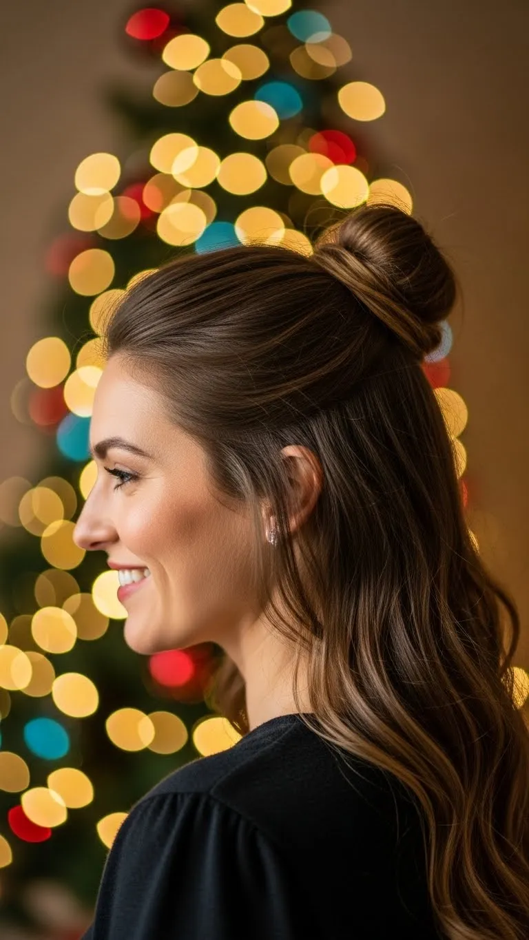 A top knot is a go-to when you want a clean, chic style. Gather hair to the crown and twist into a bun, securing with pins or an elastic. Leave a few wisps around your face to soften the look. Accessorize with a small hair clip or sparkly band for a holiday twist. Works with all hair lengths, is fast, and ideal for busy mornings before parties. Pair with bold earrings to complete the look.
