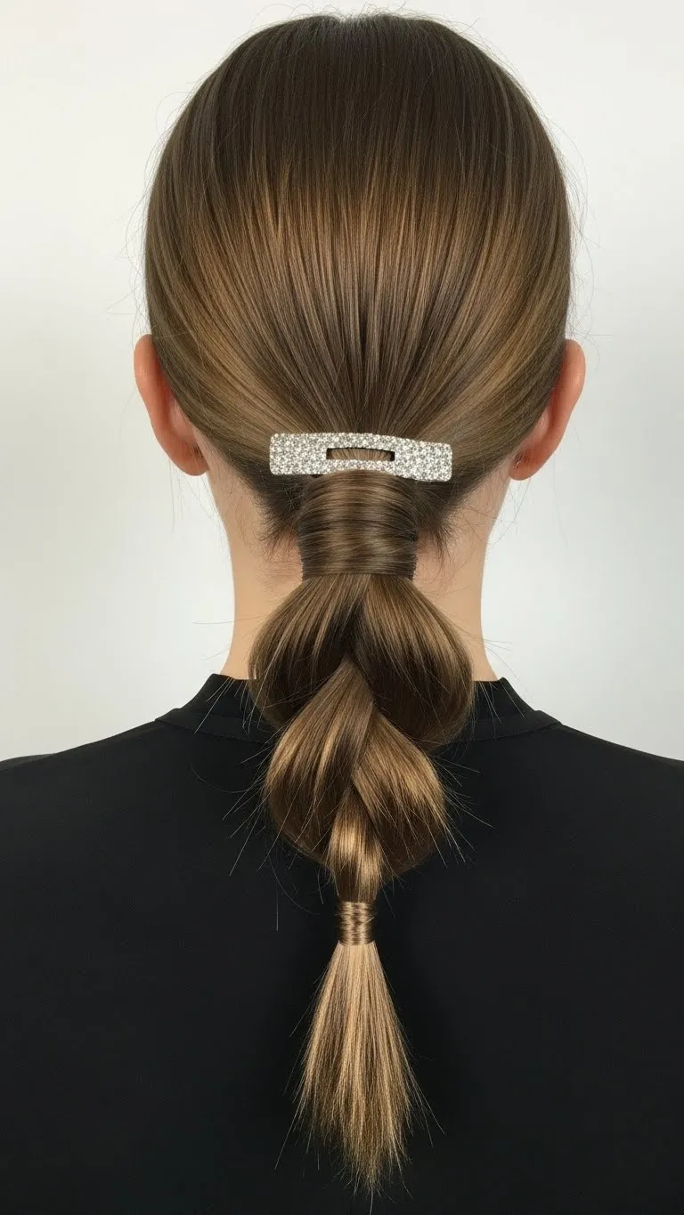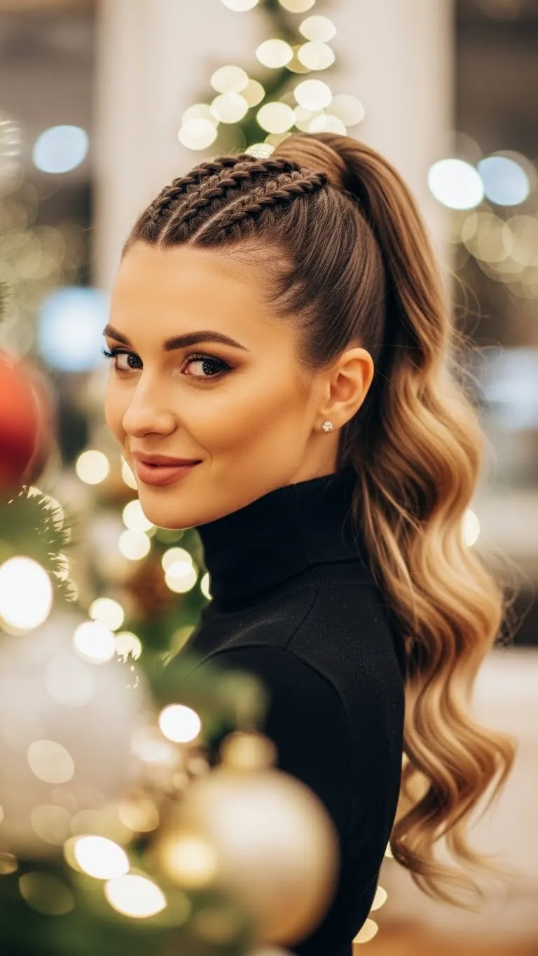 Sleek braided ponytails add polish without effort. Start with a smooth ponytail, braid a small top section, and let the rest flow freely. Works on medium to long hair and gives a sophisticated yet easy vibe. Accessorize with a clip for a festive touch.