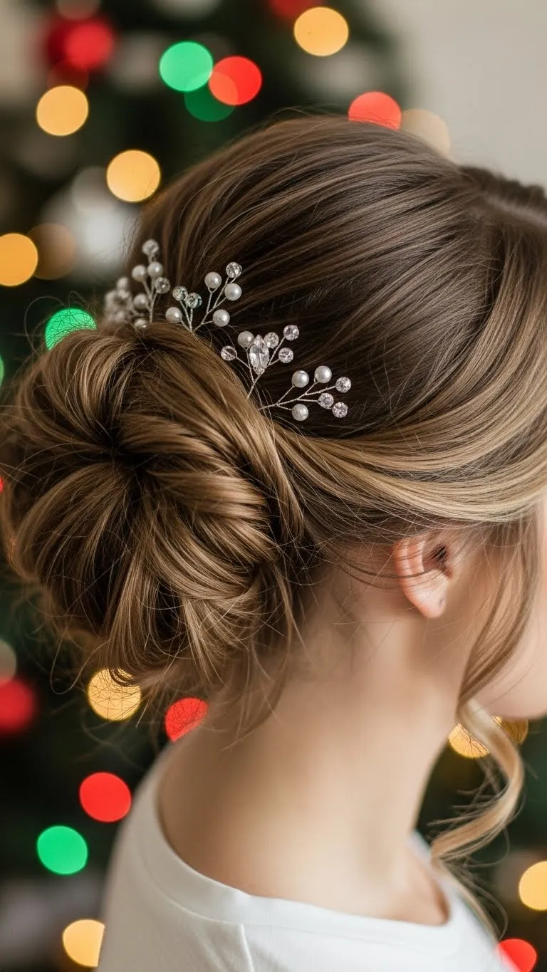 Messy buns are ideal when you want a relaxed yet put-together look. Gather your hair loosely at the crown, twist it, and pin it with bobby pins. Add decorative pins or small clips to match the holiday theme. Let a few strands fall naturally around your face for softness. This style works on short, medium, or long hair and can be done in under 10 minutes. Bonus: it hides bad hair days while still looking festive.