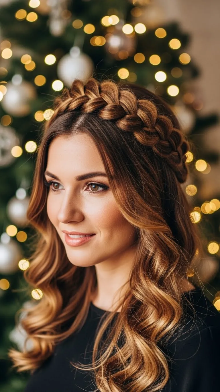 A braided crown wraps elegance around your face effortlessly. Create two small braids on each side and pin them across the crown. This works with straight or wavy hair and looks stunning with holiday hair accessories. It’s perfect for keeping hair off your face while adding a feminine touch. Try using a little texturizing spray for grip, making it easier to manage and giving a fuller look. Quick and charming for festive occasions.
